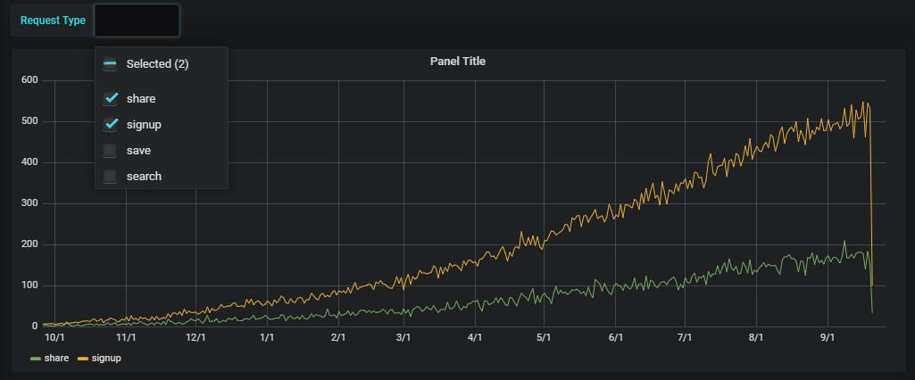 Grafana comes with the ability to define template variables that can power drop-down selections. In the below example, we’ve created a template variable that pulls in the values of the request_type column. This template variable appears as a drop-down menu in the top left. We inserted the request_type variable in the WHERE clause of our query, thus allowing Grafana to populate the WHERE clause dynamically with the value selected from the drop-down menu. You could share this dashboard of user request types with your business organization, allowing them to filter the results based on the request types they are most interested in without changing the Grafana query itself.