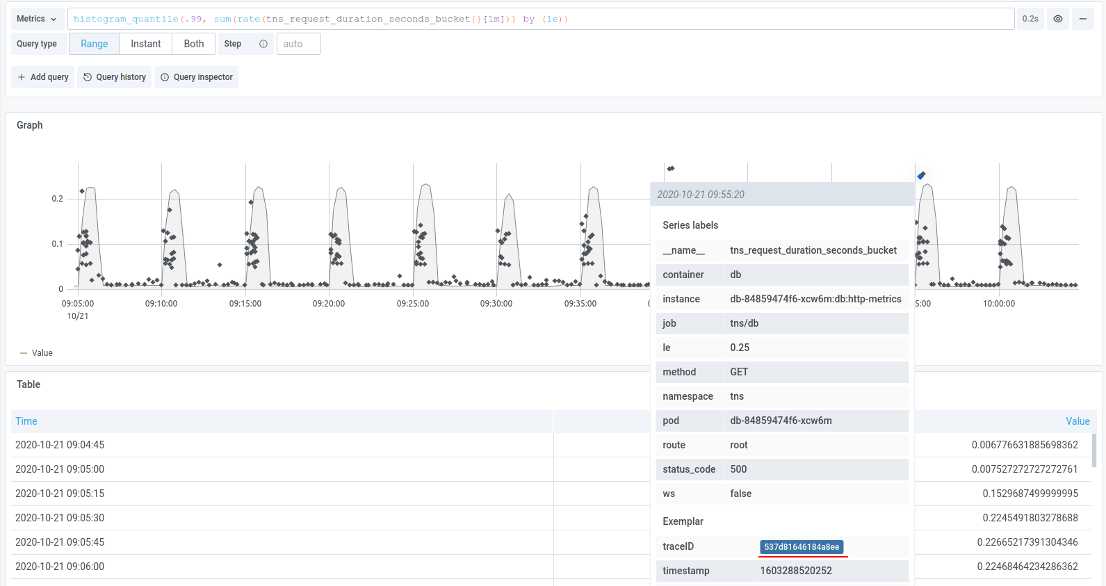 Logs allow you to find the exact trace you’re searching for based on logged fields. Exemplars let you find a trace that exemplifies a pattern. You can have links to traces based on your metrics query directly embedded in your Grafana graph. Call up p99s, 500 error codes, specific endpoints using a Prometheus query, and all of your traces now become relevant examples of the pattern you’re looking at.