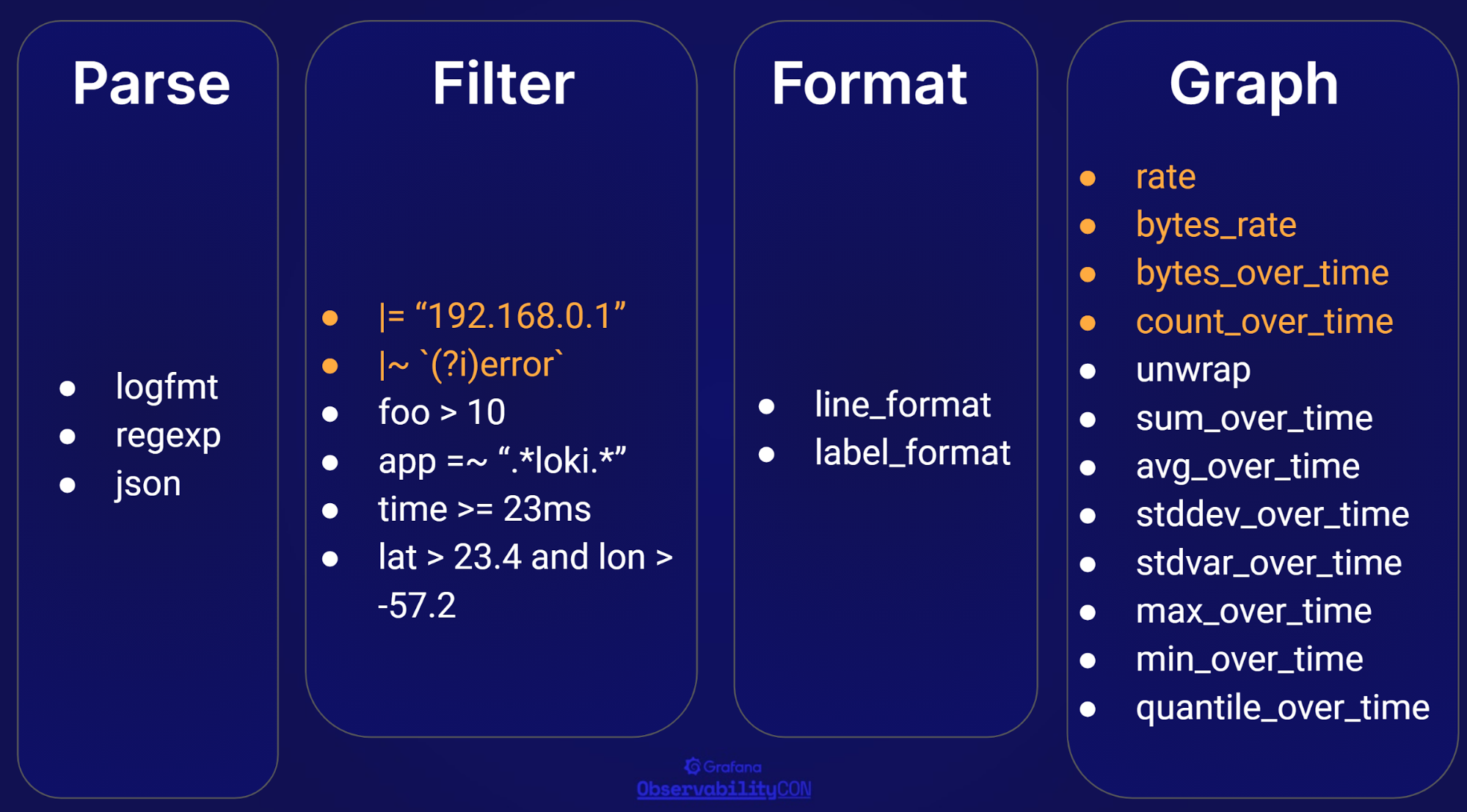 Things in orange you should already be familiar with. Filtering on log content with |= != |~ and !~, and converting your logs into metrics with rate and count_over_time were available in Loki 1.x. Everything else in white is new in 2.0, and I think it might be best to show how this works with examples, so here we go!