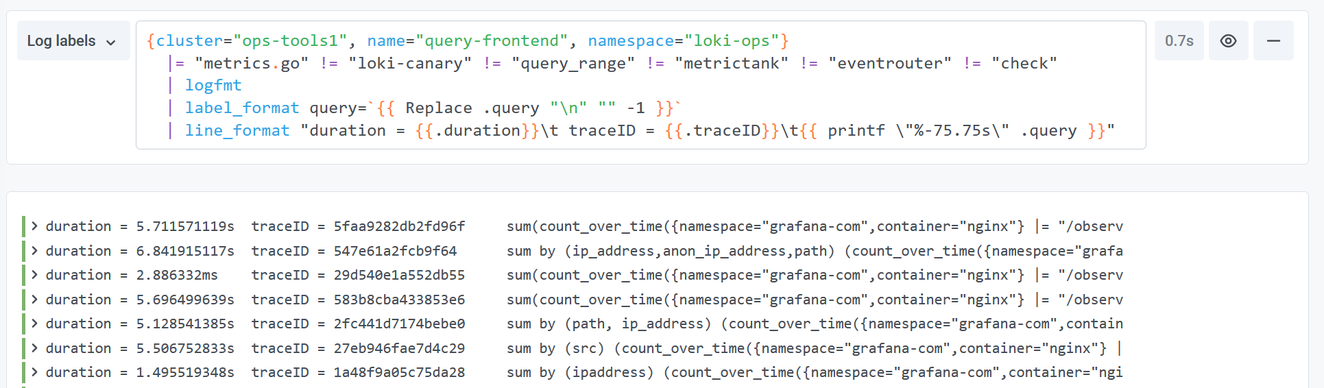 label_format and line_format leverage Golang’s templating syntax, letting you choose the relevant log lines to display. It also includes additional benefits like the ability to vertically align or truncate log contents.
