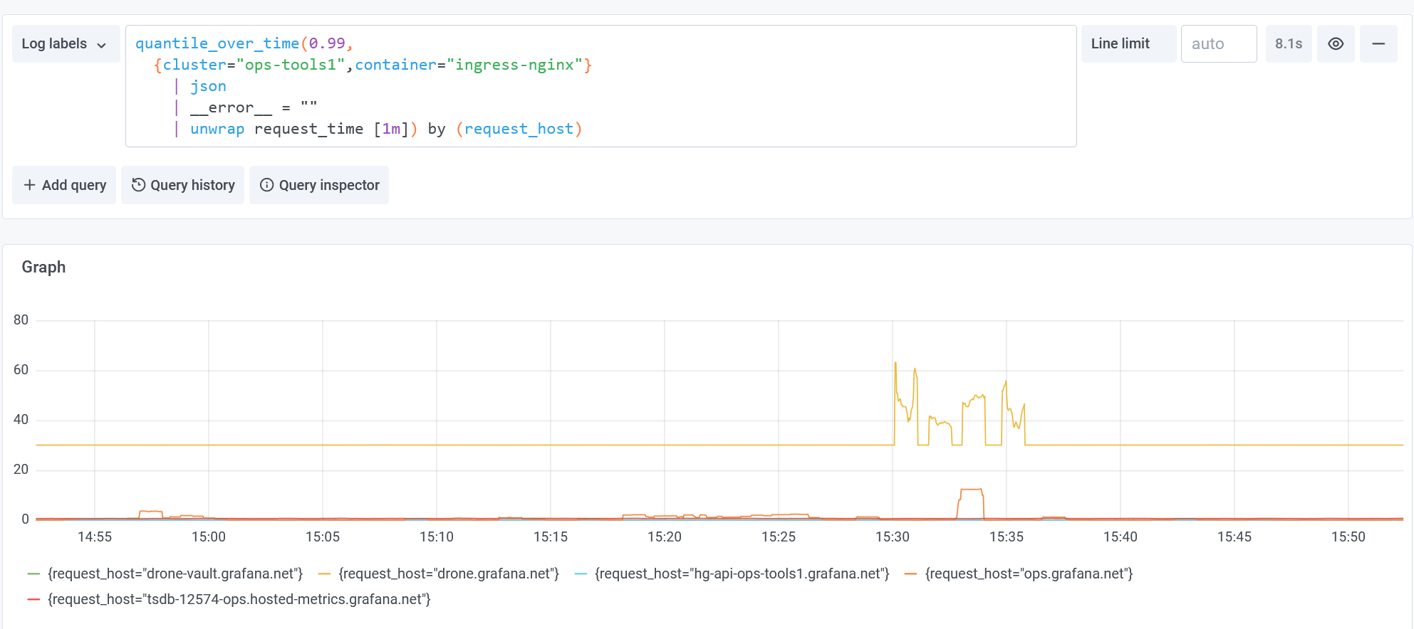 Let’s look at an example of how this could be used to show the 99th percentile request_time from NGINX access logs, aggregated by the destination server: