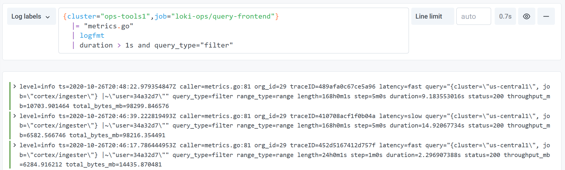 Loki 2.0 introduces much more powerful filtering capabilities. Extending on the existing filter expressions, you can filter on the content you extracted with the parser stages. Let’s look at an example showing only the log lines where the extracted duration is longer than 1s and the query_type=filter: