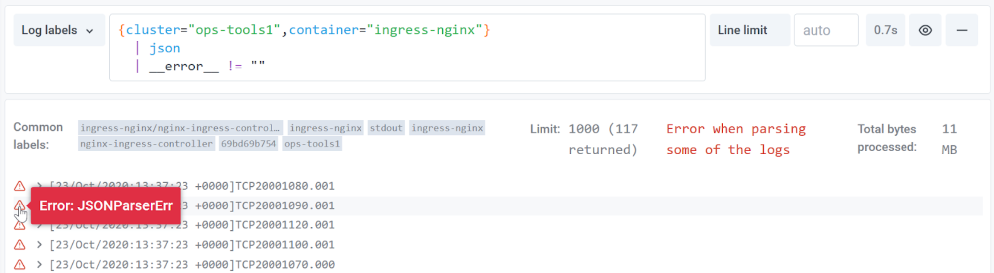 Filters are also an important part of error handling in these new features. If something goes wrong with the processing of a line, Loki will assign a new label named __error__ with the name of the error. This can be used to either select the logs that had errors to understand why: