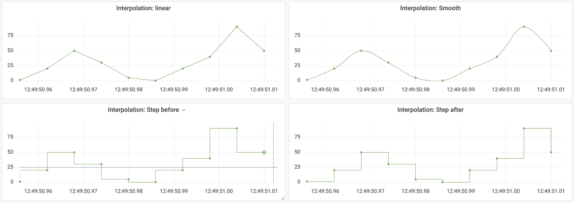 The new option introduces the possibility to render the line with an interpolation mode of your choice. Smoothing (feature request) and the control of the stepped line (feature request) are the new additions to the graph visualizations that address popular community feature requests.