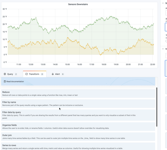 Transformations were introduced in Grafana v7.0, and I’d like to remind you that you can use them to do some really nifty things with your data. All performed right in the browser! Transformations process the result set of a query before it’s passed on for visualization. They allow you to join separate time series together, do maths across queries, and more.