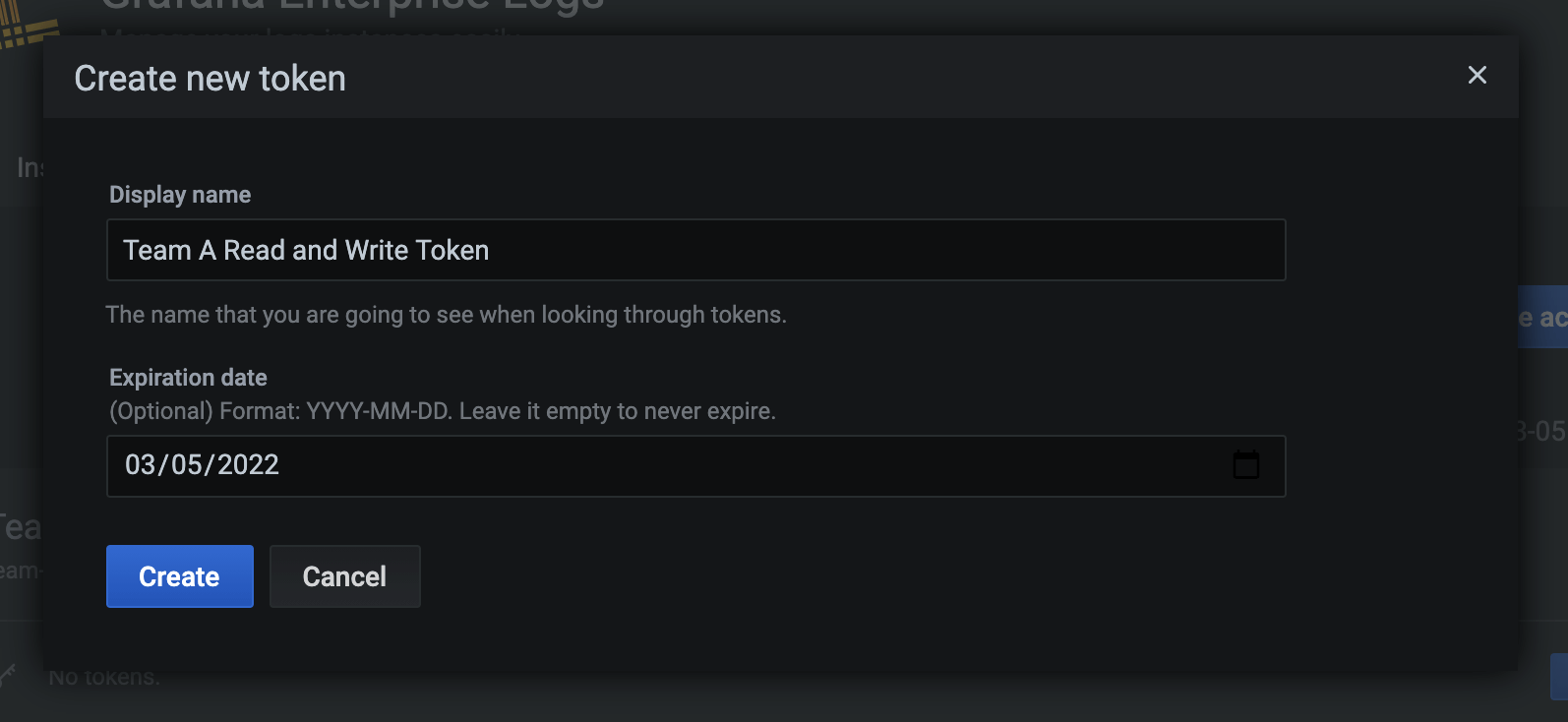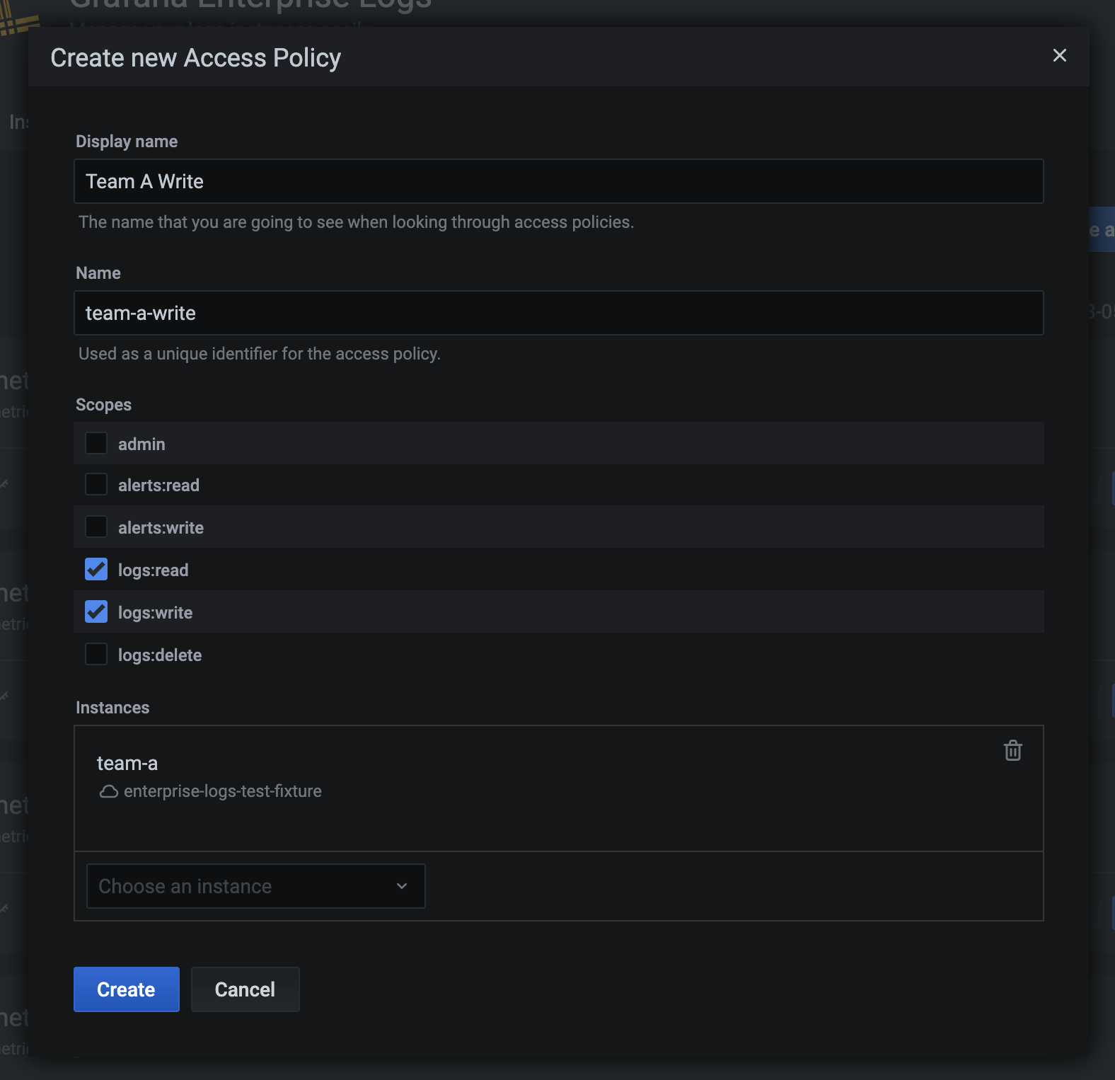 Once you have your instance and access policy, you can finally create a token. Use tokens created with this team-a-read-and-write-ap access policy to read data from this instance with Grafana, since it has the logs:read scope. You can also use them to send data into the instance using the Grafana Agent, or promtail, the standalone Loki client, because the associated access policy also has the logs:write scope.