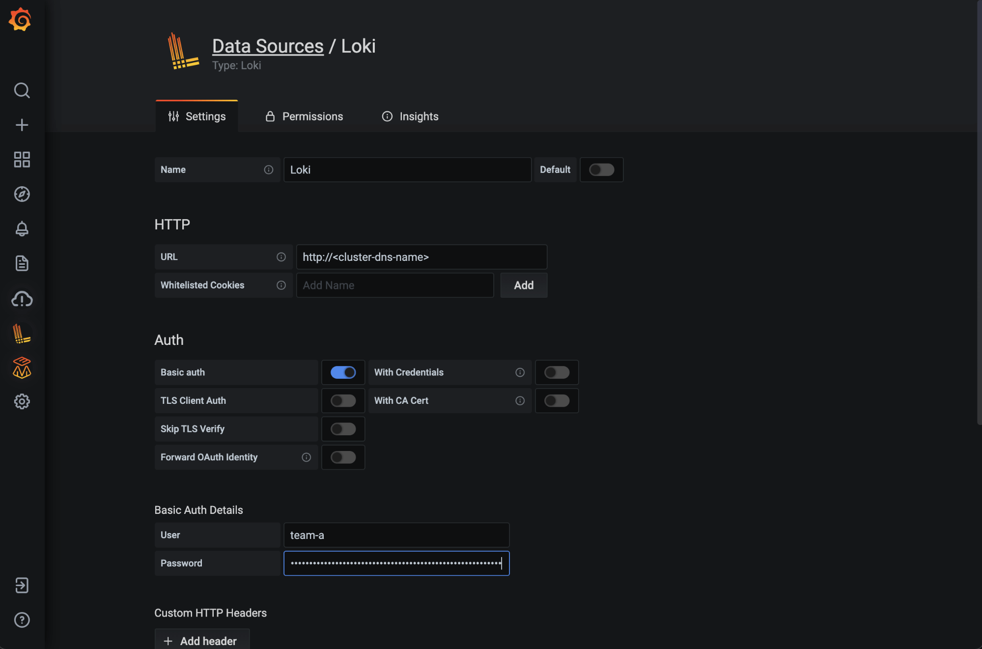 Now that you have logs flowing into your GEL instance, let’s configure Grafana to view them. Create a Loki data source with the URL set to your cluster name as shown below, as well as specifying Basic auth. Note that team-a is the username. Specify the token as the password and save the data source.