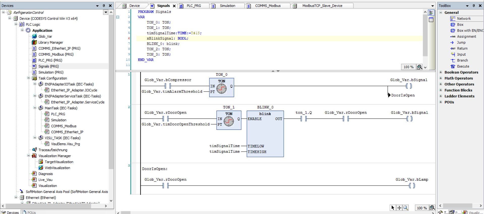 We adopted the demo Refrigerator Controller project to support a simple Modbus Client Device, with all the associated program inputs and outputs mapped to their respective memory structures as supported by the protocol. Let’s take a glimpse at what that was like.