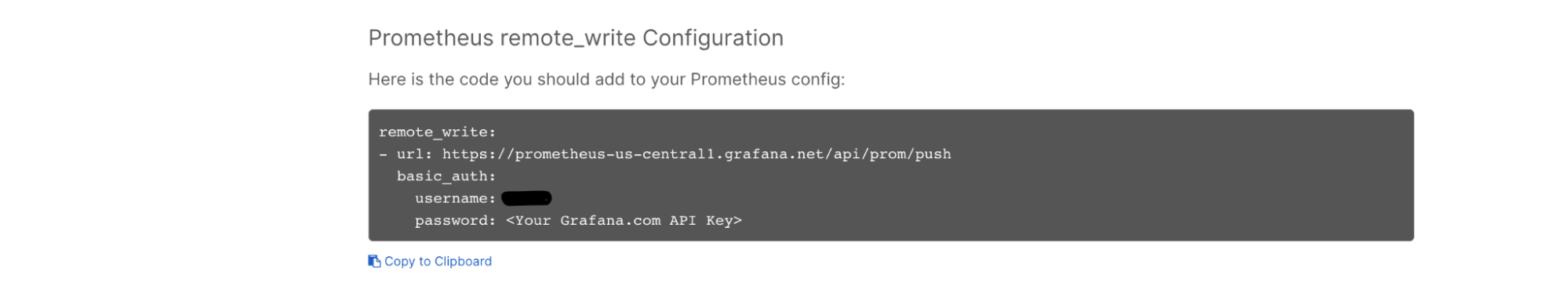 That should take you to a page with your instance url, Username/InstanceID, and API Key. If you scroll down a bit you’ll see a field that says Prometheus Remote_Write Configuration. You’ll need this configuration when we edit the prometheus.yml file later.