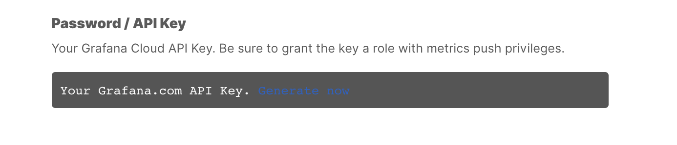 On that same page you’ll be able to create your API Key to fill in the password field in the remote_write configuration above. To create the key, click the blue “generate key” link in the API Key field. It’s kind of hard to see at first, so here’s a screenshot: