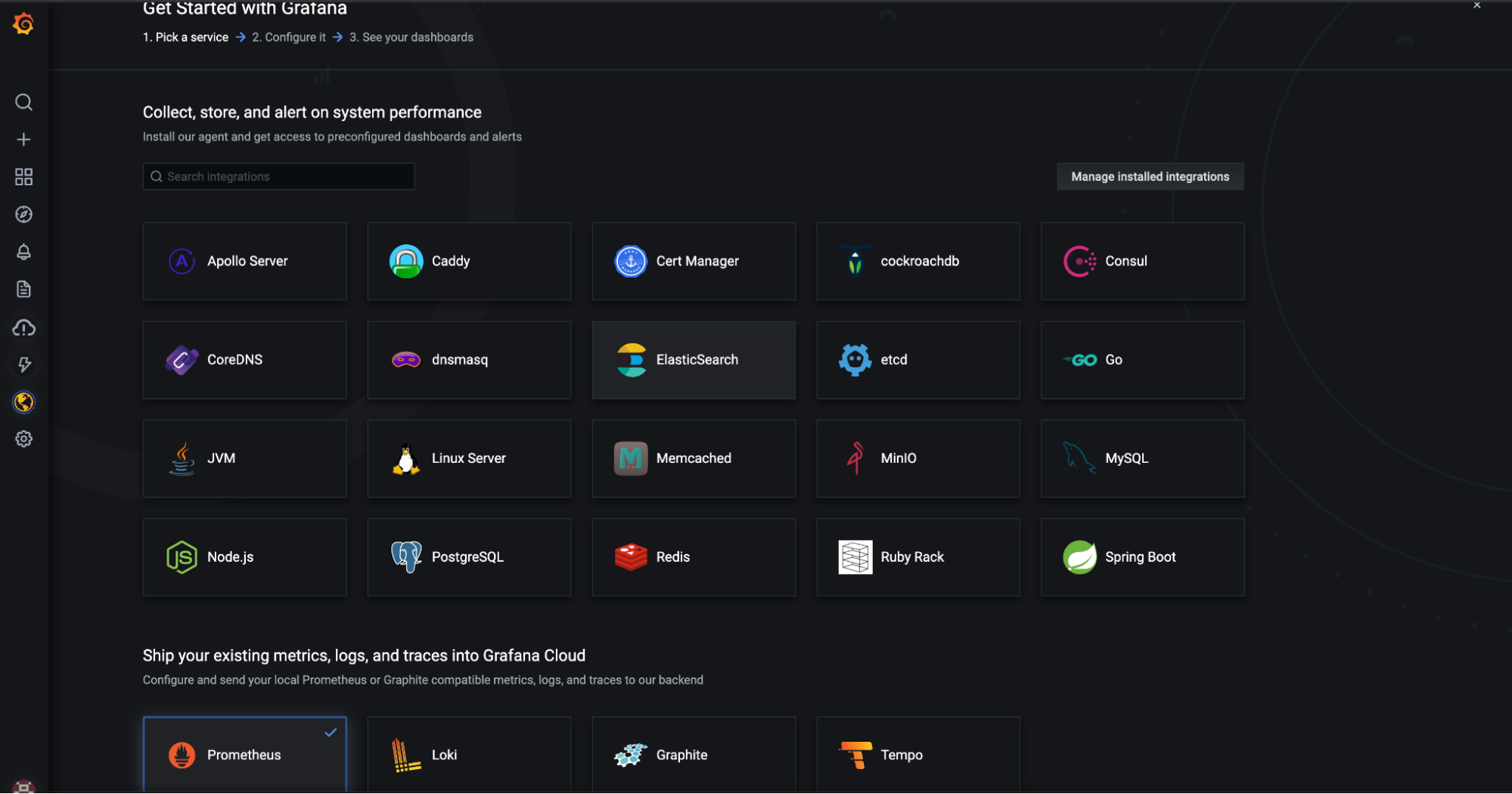 Once you’ve created your Grafana Cloud account, you will be redirected to the onboarding walkthrough page. Find Prometheus (shown below) and click continue to configure it.