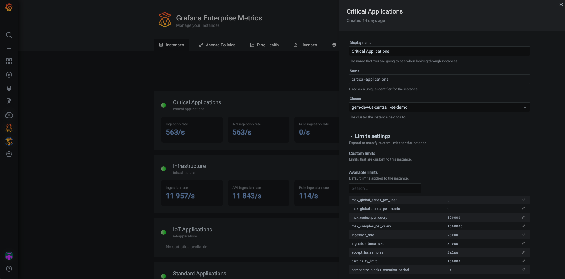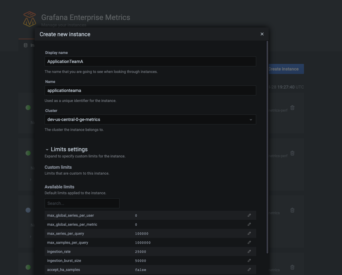 Setting custom instance limits at the time of creating the instance. (Grafana Enterprise Metrics uses the word “instance” when referring to a “tenant.”)