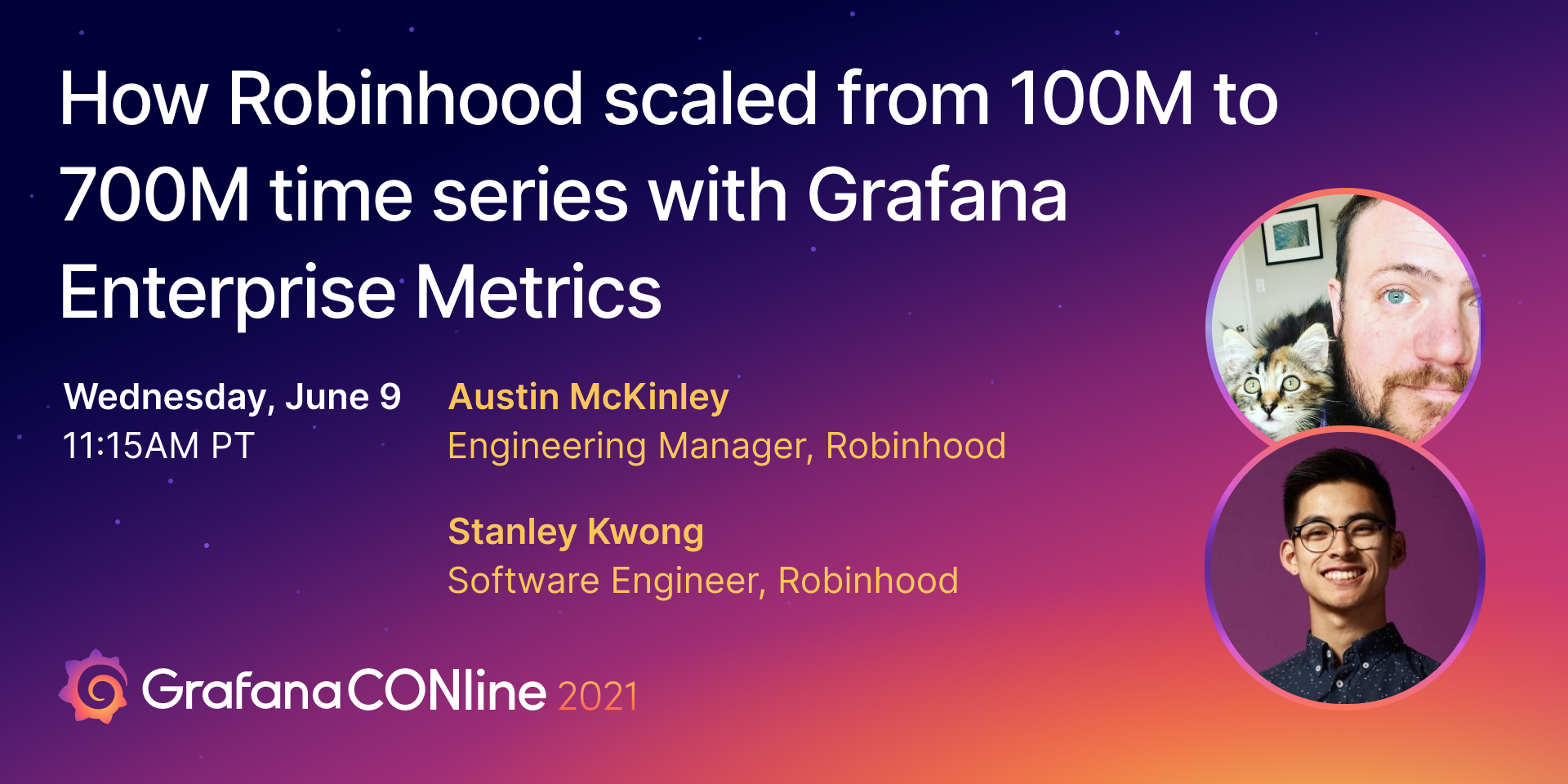 Earlier this year, the stock-trading app Robinhood was inundated with GameStop trades, making observability mission-critical. Engineering Manager Austin McKinley and Software Engineer Stanley Kwong from Robinhood shed light on their company’s history with Prometheus and, as Kwong put it, Robinhood’s “most viral GitHub issue.” After Robinhood was no longer able to scale Prometheus, the two-person observability team handled the challenge by migrating to Cortex and then Grafana Enterprise Metrics to scale from 100M time series on Prometheus to 700M — make that now 1 billion time series! — on Cortex.