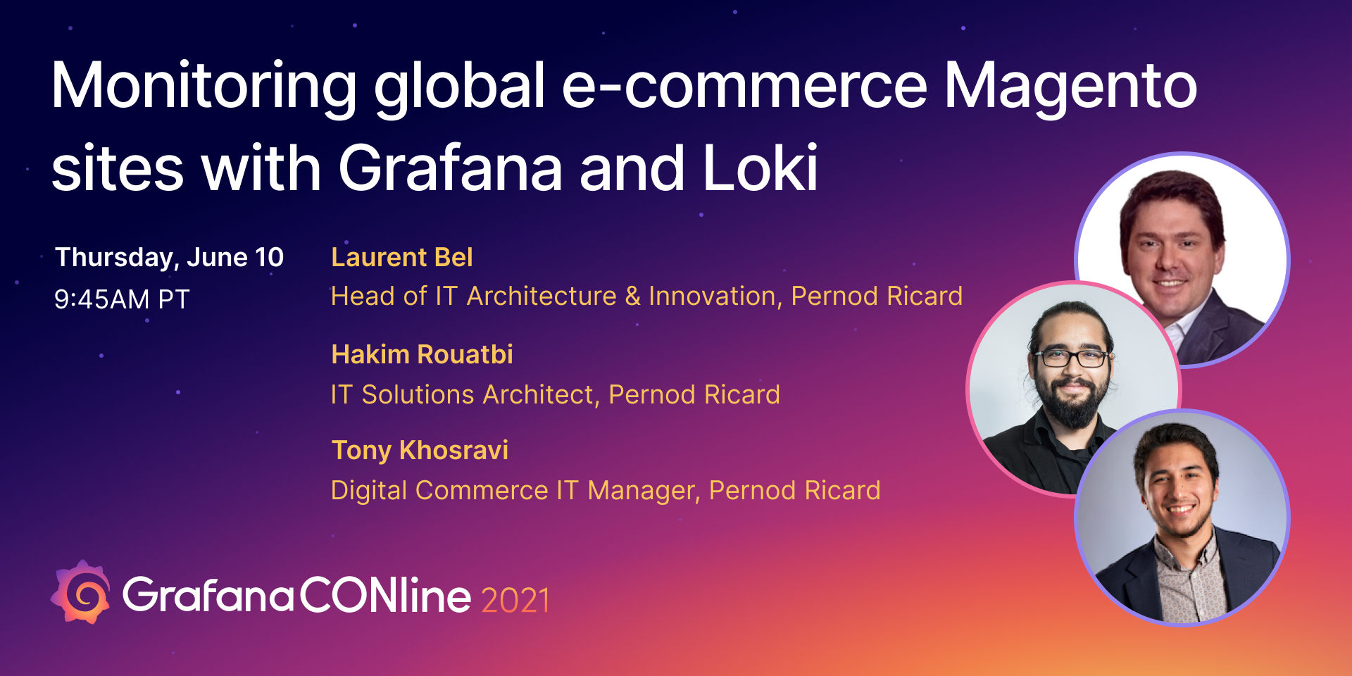 Pernod Ricard, a leader in the wine and spirit industry, has scaled its e-commerce business to run 30 Magento websites across the globe. Their e-commerce stack is deployed on AWS over four different regions, containerized and orchestrated with ECS. Grafana and Loki are used for monitoring and logging — not to mention keeping customers satisfied as business is predicted to grow by 23% by 2023. In this session, Pernod Ricard Head of IT Architecture & Innovation Laurent Bel, IT Solutions Architect Hakim Rouatbi, and Digital Commerce IT Manager Tony Khosravi uncorked the details behind their infrastructure starting with a high-level view of their stack followed by a deep dive into individual components such as CloudFront real-time log streaming to Loki and CloudWatch monitoring integrated with Grafana.