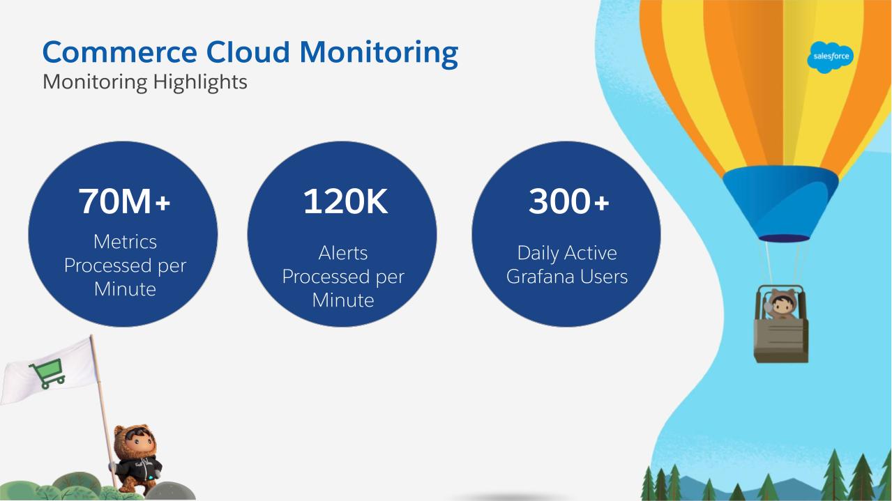 Salesforce processes more than 70 million e-commerce metrics per minute. From those metrics, the company’s internal teams have configured thousands of unique alert definitions. Grafana alerting, in combination with Salesforce’s own alerting service, processes more than 120,000 alerts per minute to provide proactive monitoring capabilities to its internal teams. Each day, Grafana serves more than 300 active users across the company’s internal teams.