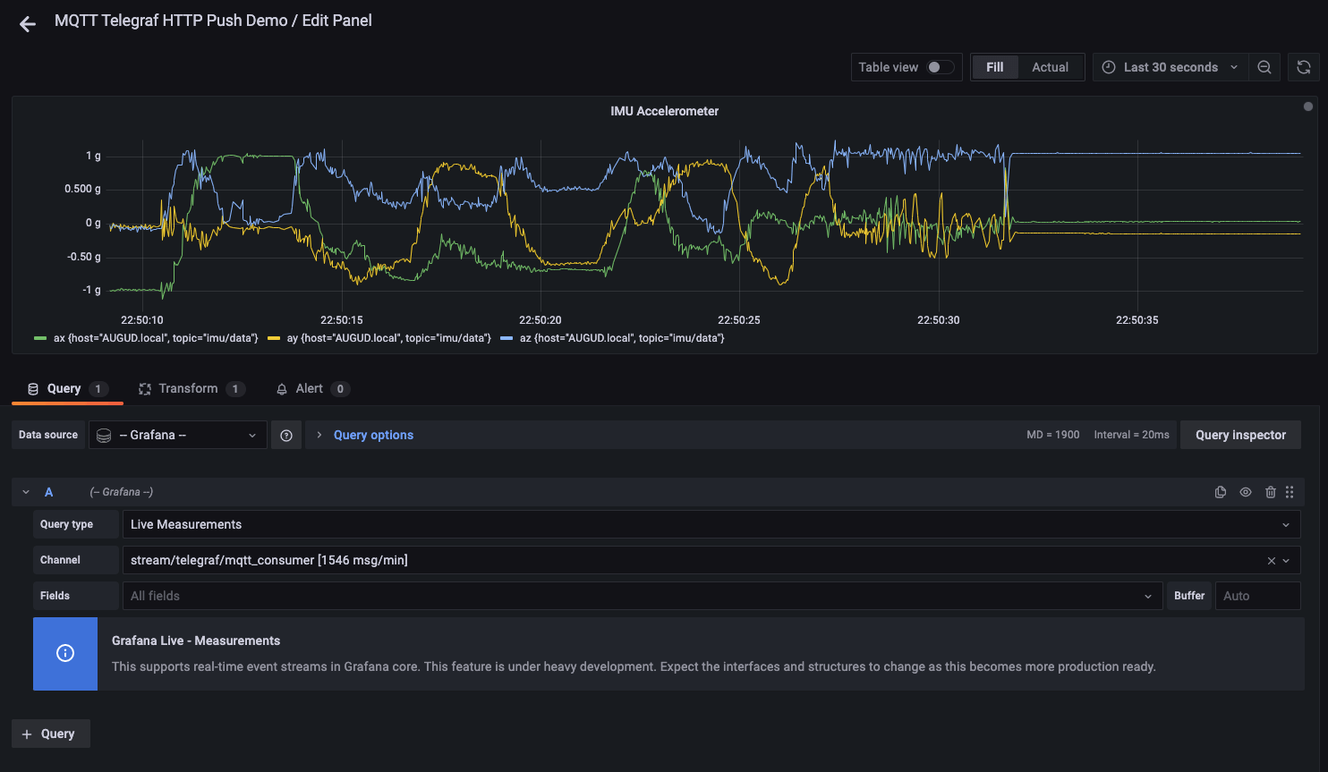 In a previous blog post, we used an IMU-based sensor system communicating over the MQTT protocol to stream real-time sensor data to Grafana Live. Here, we will use the same setup to demonstrate the ease of use of the HTTP Push end-point to stream Telegraf metrics using Grafana Live.