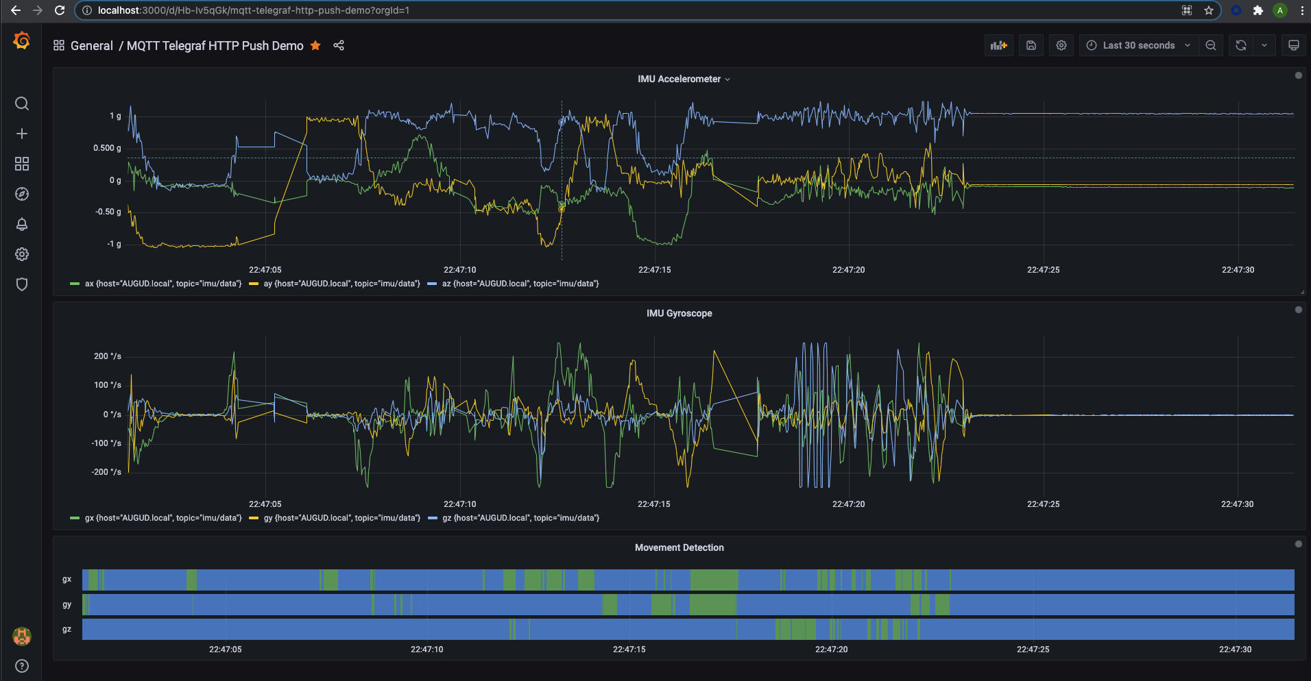 The setup for the IMU sensing board and the MQTT broker for publishing is outlined in the demo featured here. The only difference is how that IMU data is ingested into the Grafana Live engine.