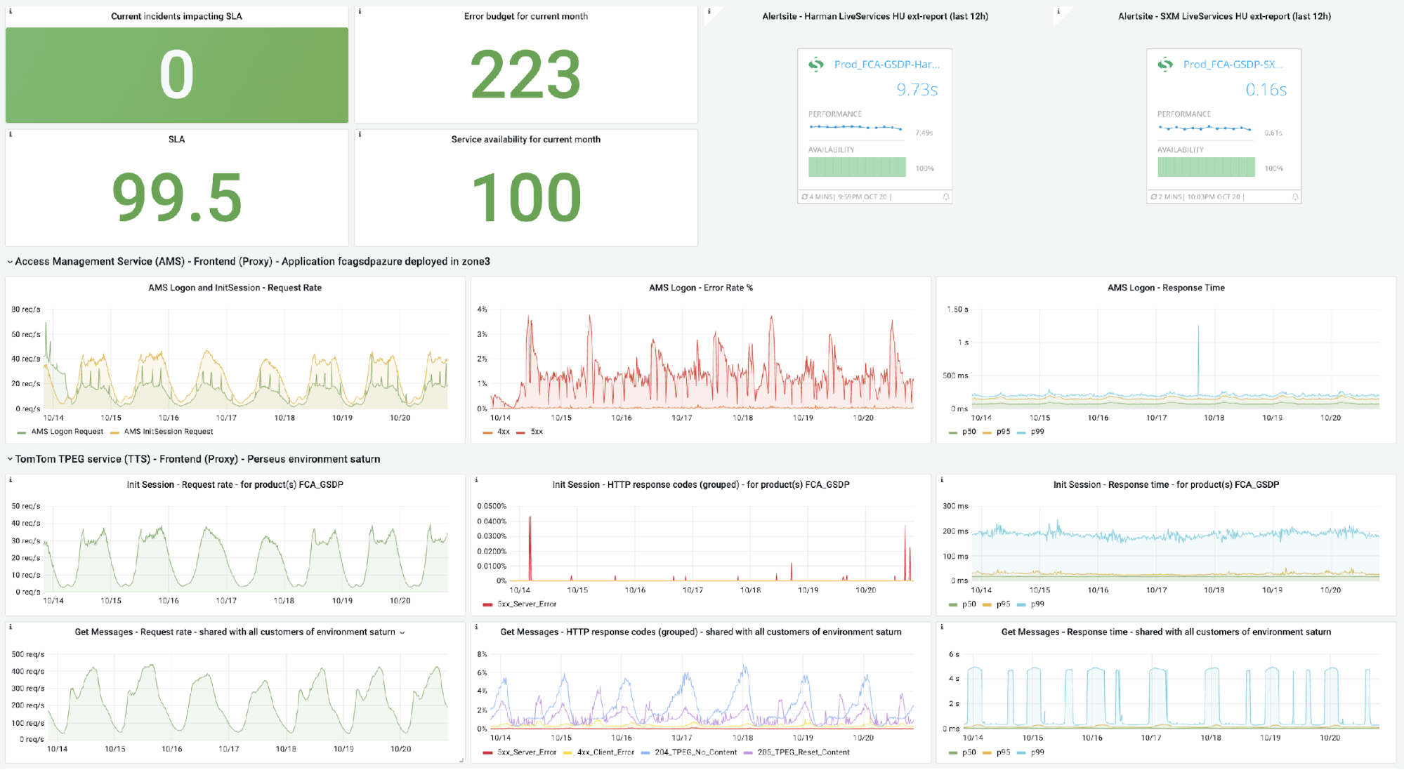 Above: TomTom business dashboard tracking SLAs, blackbox monitoring metrics, and service statuses.