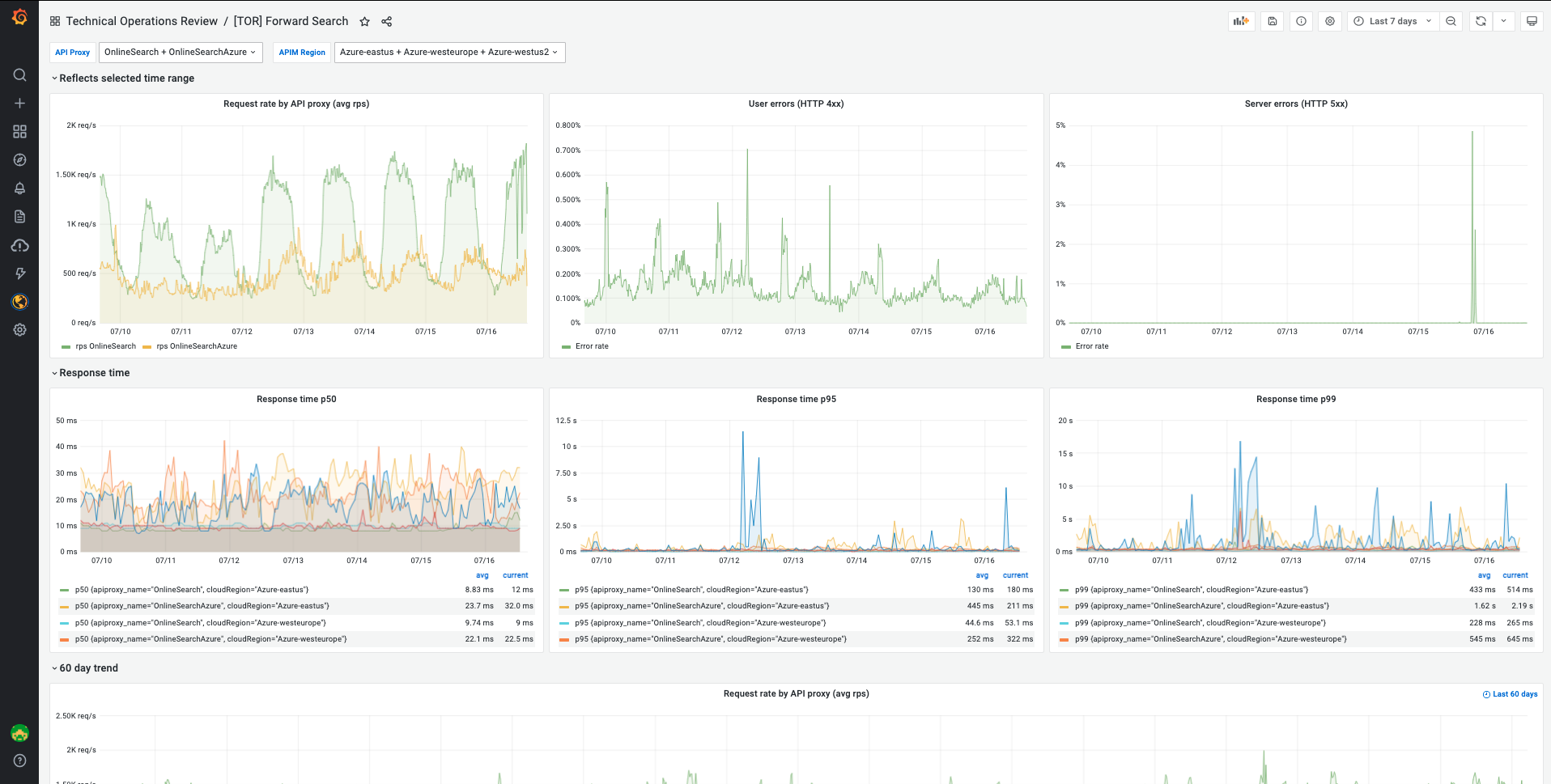 With their business dashboards in place, the TomTom team decided to introduce weekly technical operational reviews. These meetings regularly bring together teams to discuss various customer experience metrics and use Grafana as the jumping off point to analyze performance.