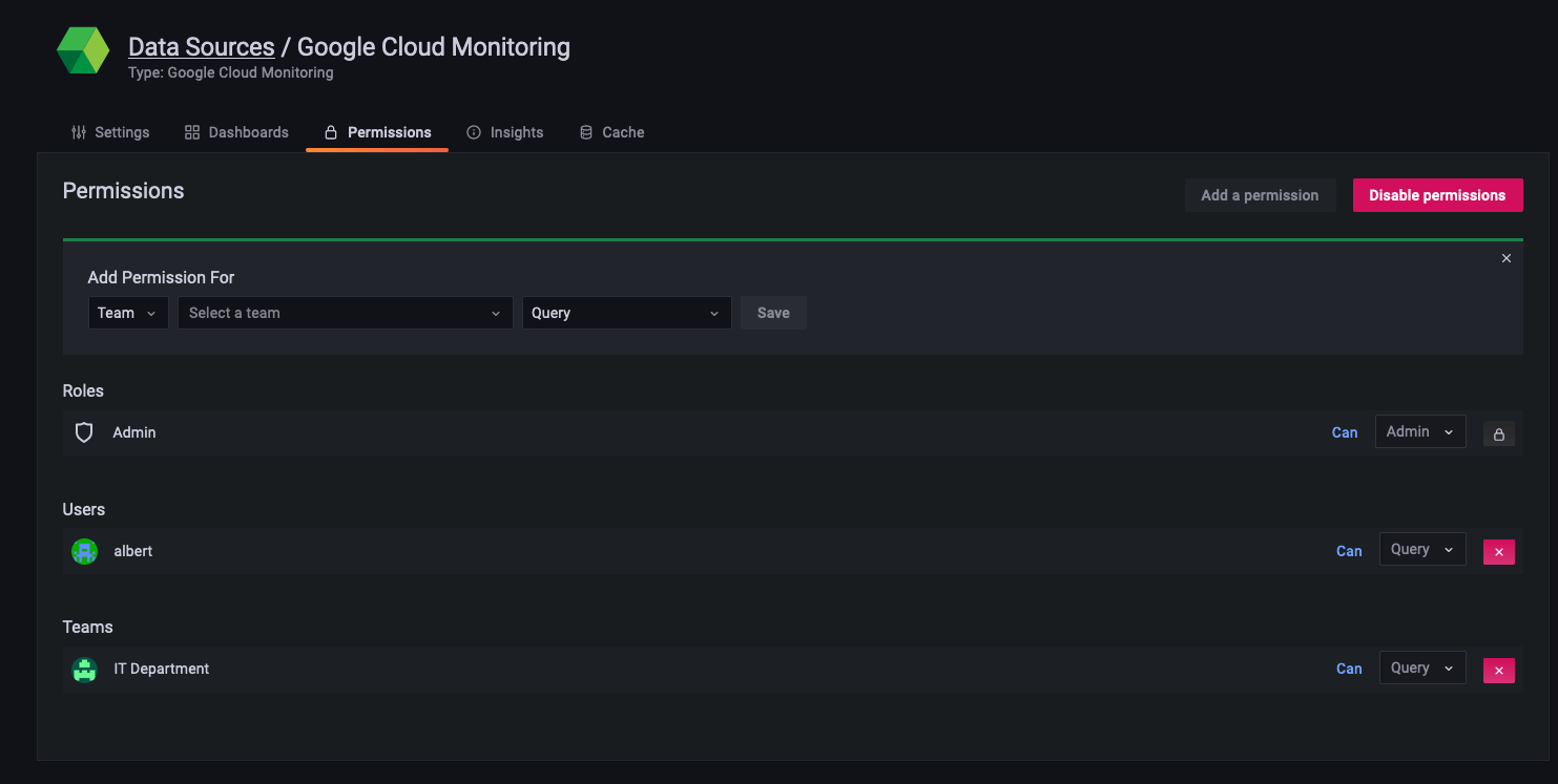 In this data source permissions example above, only a user with the name “albert” as well as the users in the team “IT Department” have read access to data from the Google Cloud Monitoring data source.