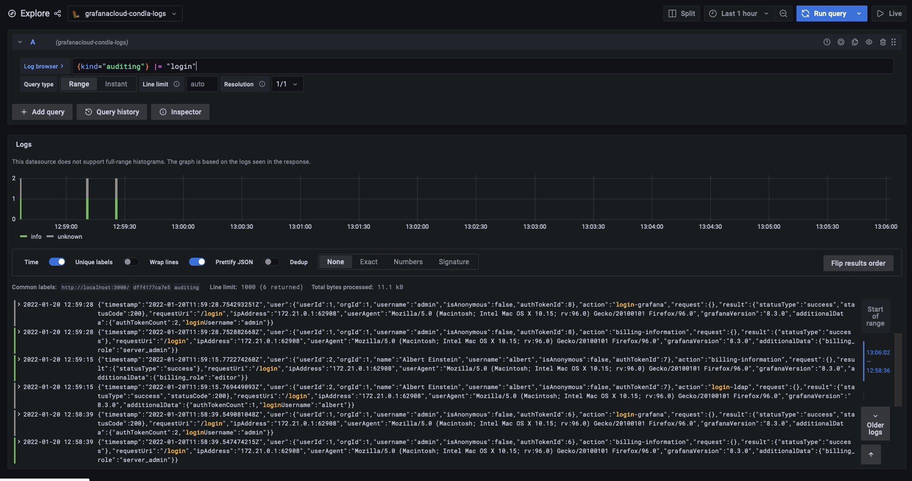 The audit capabilities are well integrated into Grafana itself. Here, you can see a simple Loki query to show the login events to the Grafana instance in the last hour.