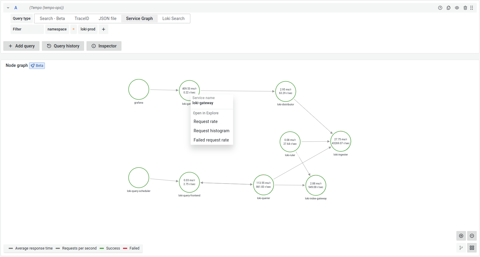 Above: Service graphs using Grafana Tempo server-side metrics.