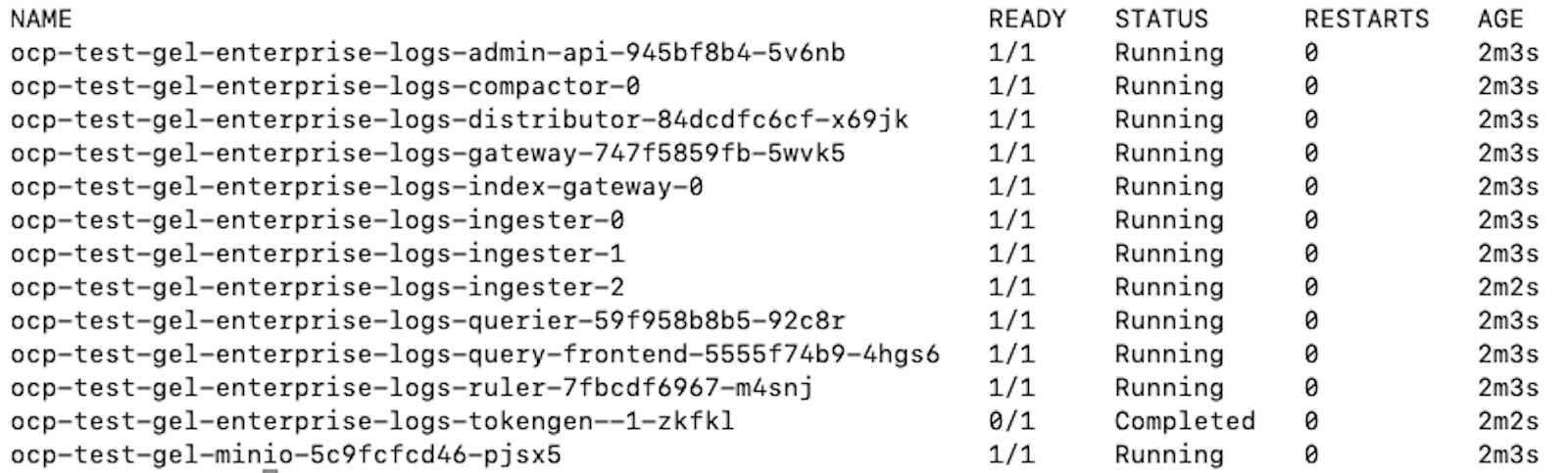 --set loki-distributed.rbac.pspEnabled=falseStep 4: Check the status of the Pod that is running the tokengen job, and once it’s completed, check that job’s logs for the new admin token: