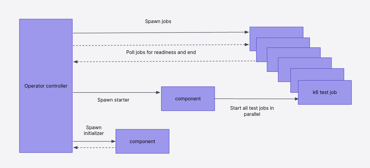 The operator will listen for changes to, or creation of, k6 custom resource objects. Once a change is detected, it will react by modifying the cluster state, spinning up k6 test jobs as needed. It will then use the parallelism argument to figure out how to split the workload between the jobs using execution segments.