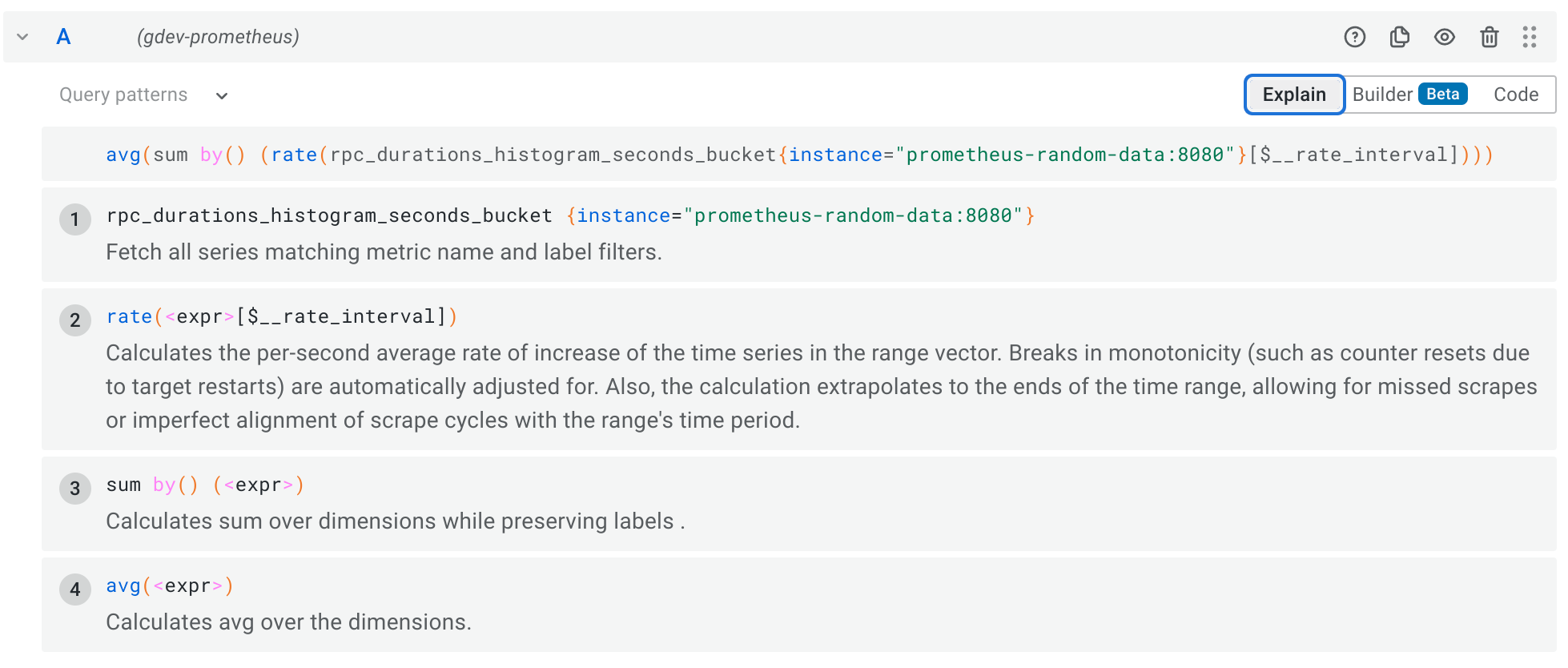 The Prometheus query builder helps with understanding queries in a couple of different ways.