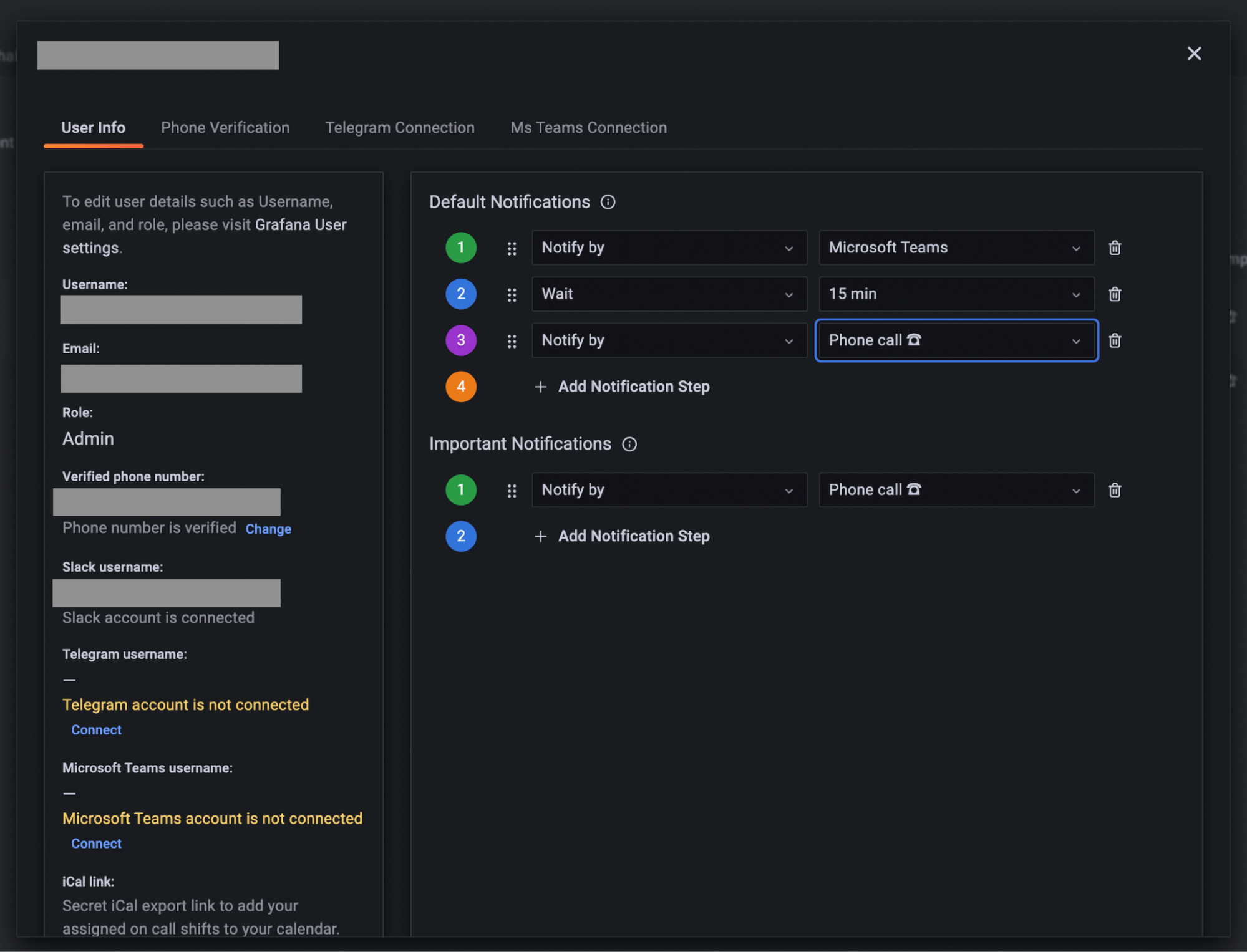 OnCall users can control how they are notified via their user settings page within Grafana OnCall. (This is separate to the Grafana user settings page.) You can see the setup below in which a Grafana Cloud user is notified via Microsoft Teams notification first for default notifications and via a phone call for important notifications.