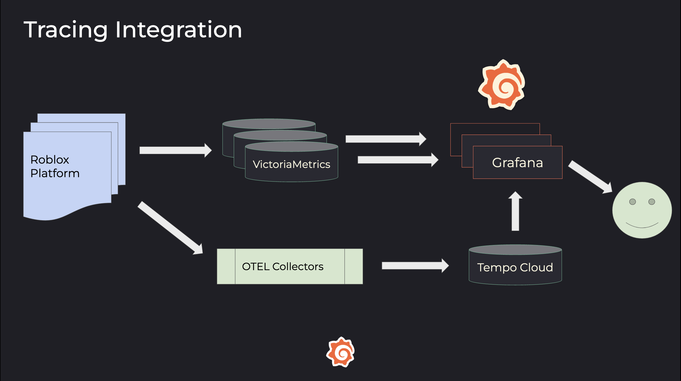 Diagram showing Roblox architecture with Grafana Cloud Traces using logos and arrows.