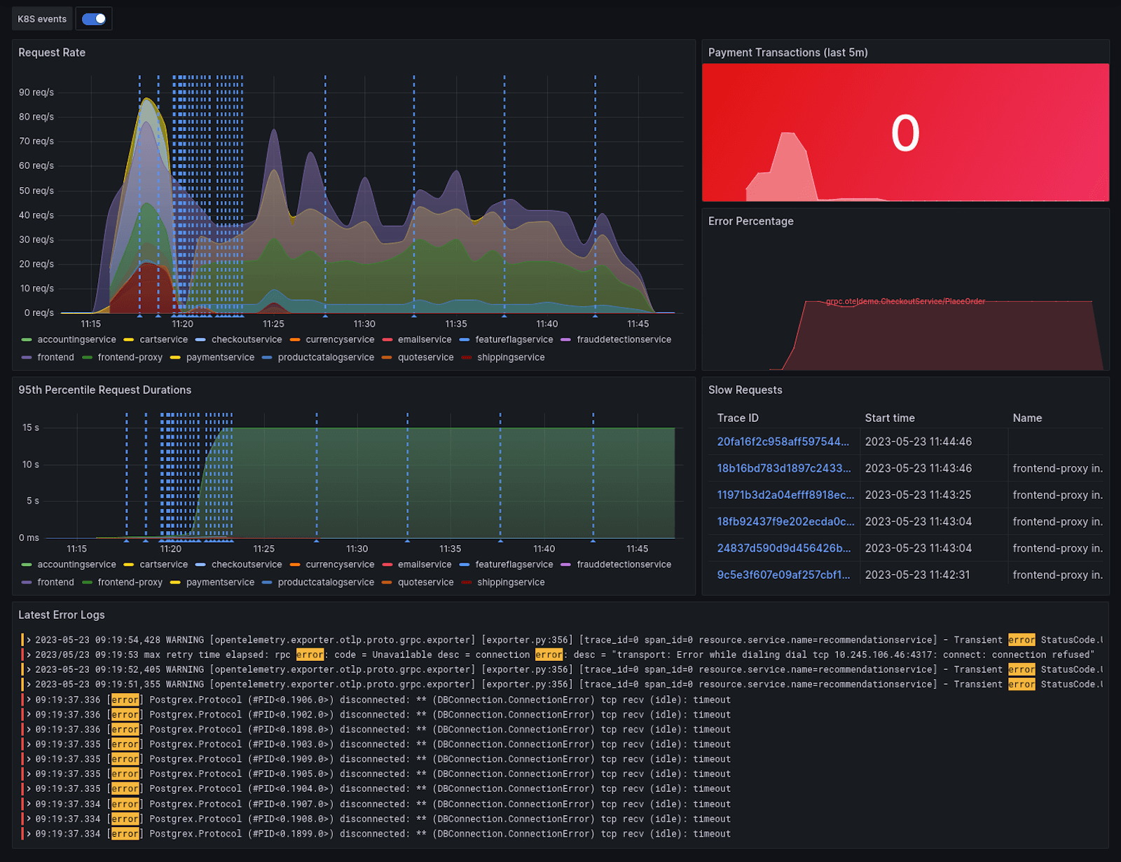 The demo application is fully instrumented, but having to remember queries can be quite challenging. The great thing about creating a Grafana dashboard is that you can pull data from all of your sources and have it in one place. The result is a beautiful overview of all your telemetry data like this: