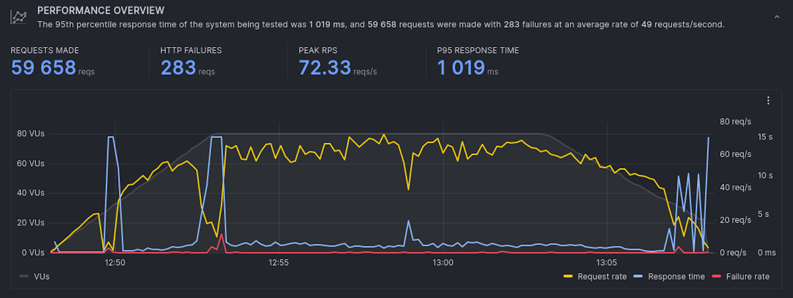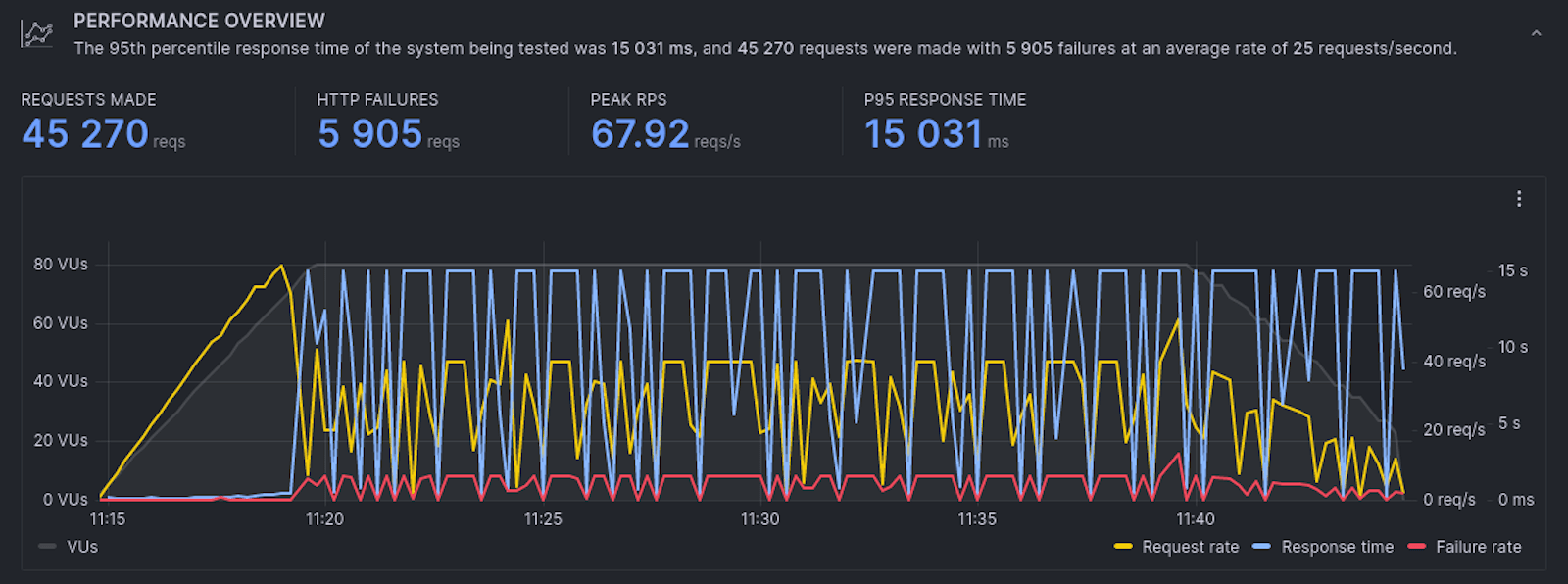 While the load was ramping up to 80 VUs, I was able to observe a sudden drop in request rate (yellow) and failure rate (red), as well as inconsistent response times (blue).