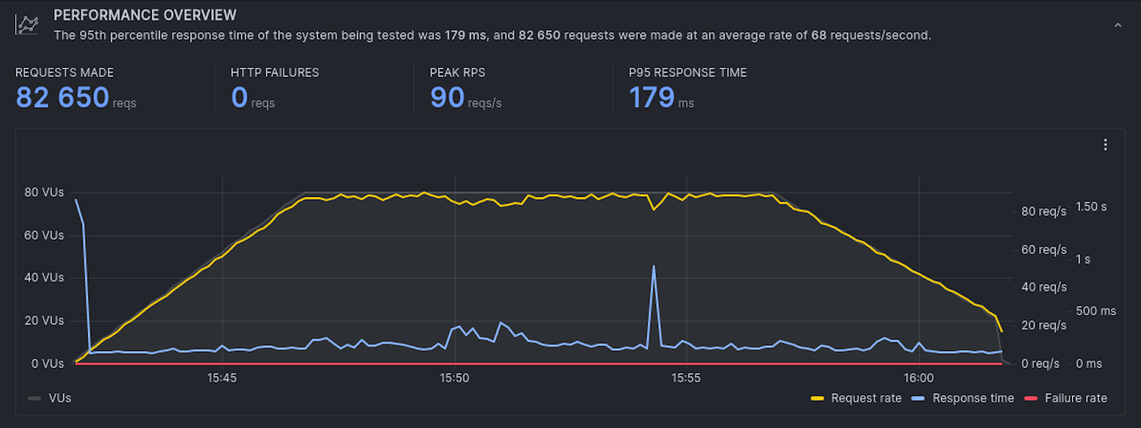 As you can see, the load curve does not noticeably affect latency, and all our defined thresholds hold. To avoid running into the same issues again, it would be a good idea to run this test on a schedule or integrate automated load testing into a CI/CD pipeline.