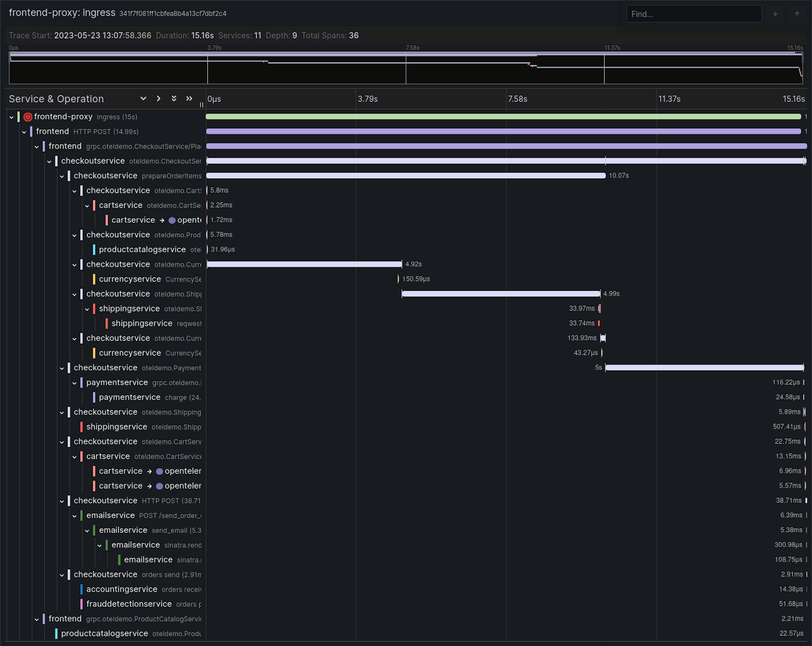 By correlating the increase in the test run with my dashboard, I can see that the slowdown originates from the checkoutservice. However, this time the service is not crashing — it is just slow to respond. To see what’s taking it so long, I can utilize tracing.