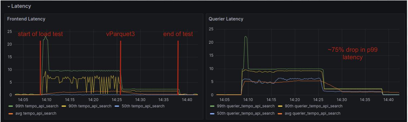 We’ve tested this in clusters of more than 600 MB/s and 1.2 million spans/s, with great success. During a load test in one of these clusters, we experienced decreases of tail latency of up to 75%, and decreases of CPU and memory usage in Tempo’s queriers of up to 70% and 50%, respectively.