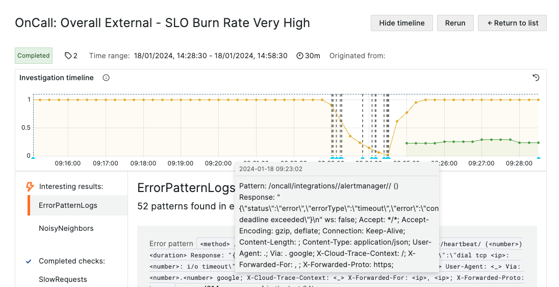 Sift now tracks the metric associated with the alert or SLO that triggered the investigation, and it charts that metric on a timeline panel for quick reference. Events found by Sift’s checks are then overlaid on the metric as annotations to allow easy correlation between different events. For instance, in the screenshot below, an easy observation is that error patterns of a specific type started exactly as the SLO budget burn alerts started firing for one of our services!