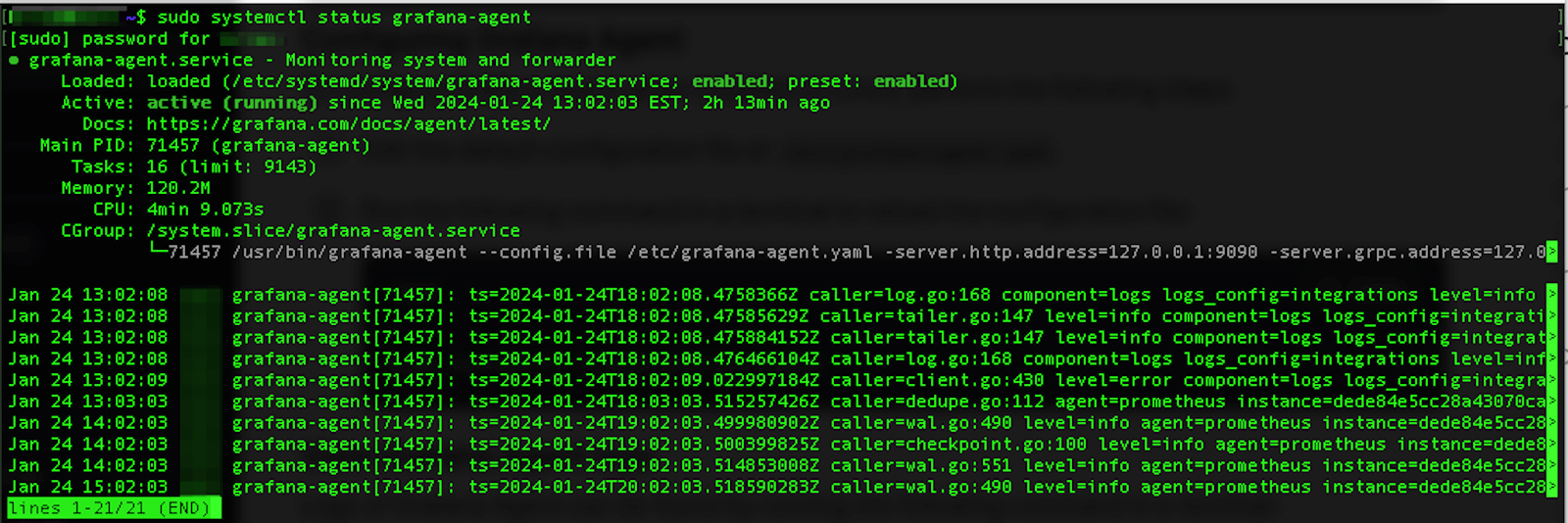 You can find the instructions on how to deploy Grafana Agent in our docs. The installation on Linux is very easy if you’re familiar with installing packages using apt-get. You can check the status of the service using systemctl. Executing the command sudo systemctl status grafana-agent displays the following: