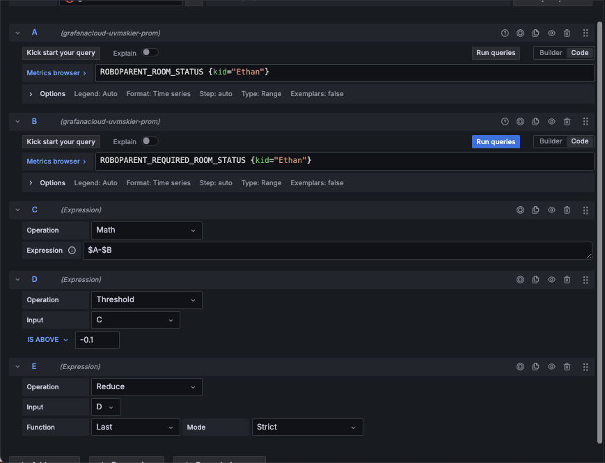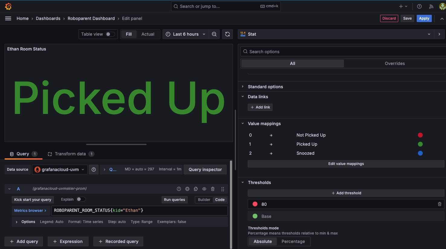 In particular, I set out to monitor my kids’ cleaning progress in Grafana Cloud, as well as automatically notify them if they failed to clean their rooms. The result of this mission is what my wife Elizabeth and I (lovingly) refer to as Roboparenting