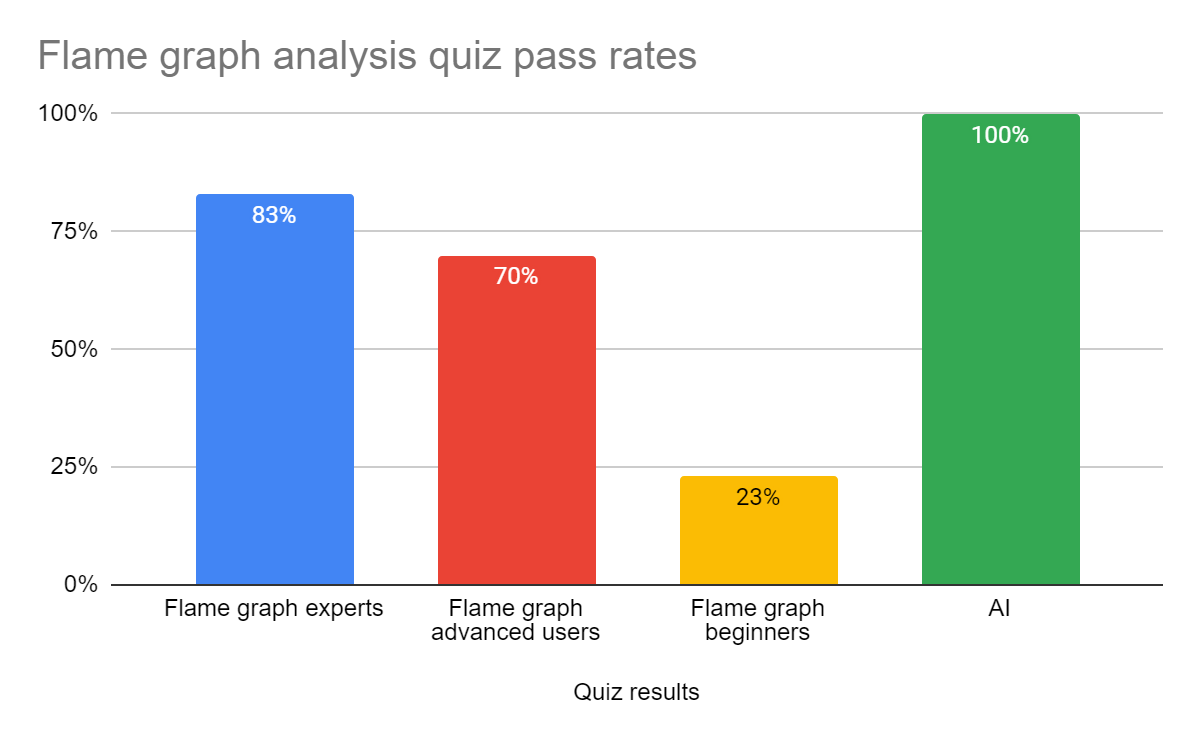 - Flame graph expert users: 83% passed. They demonstrated high accuracy and detailed understanding, quickly pinpointing issues and interpreting them correctly