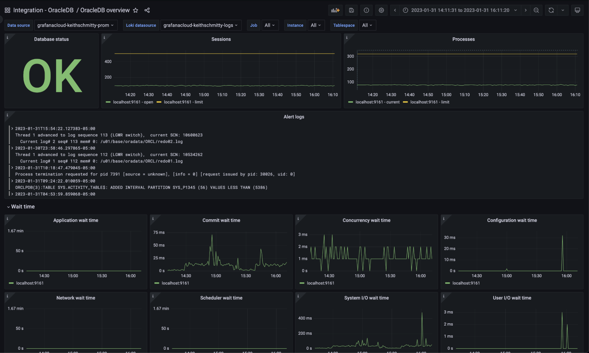 With this work done, metrics and logs are flowing into Grafana Cloud from my OracleDB and I can view the out-of-the-box dashboards.