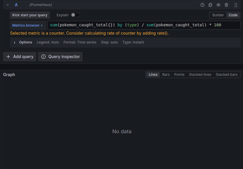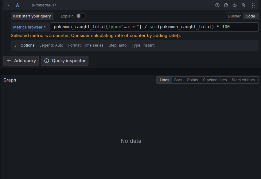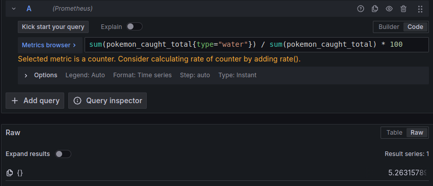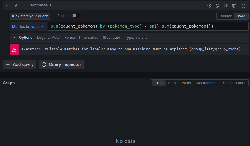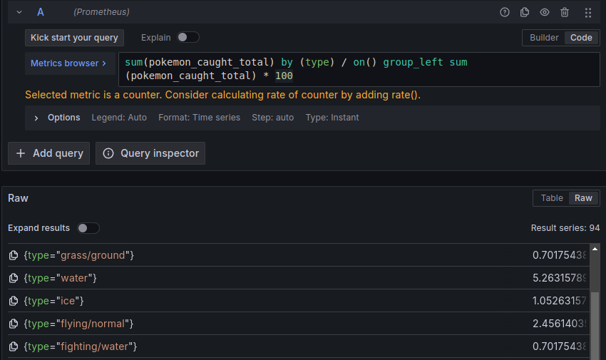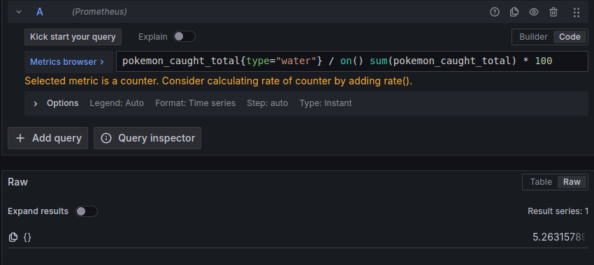 Since we have queried all the interesting Pokémons on the left side, we can also use sum to get the sum across the series. Now both sides have no labels, so Prometheus can match them. However, what if we wanted to create a chart of the percentages of Pokémon types we caught?