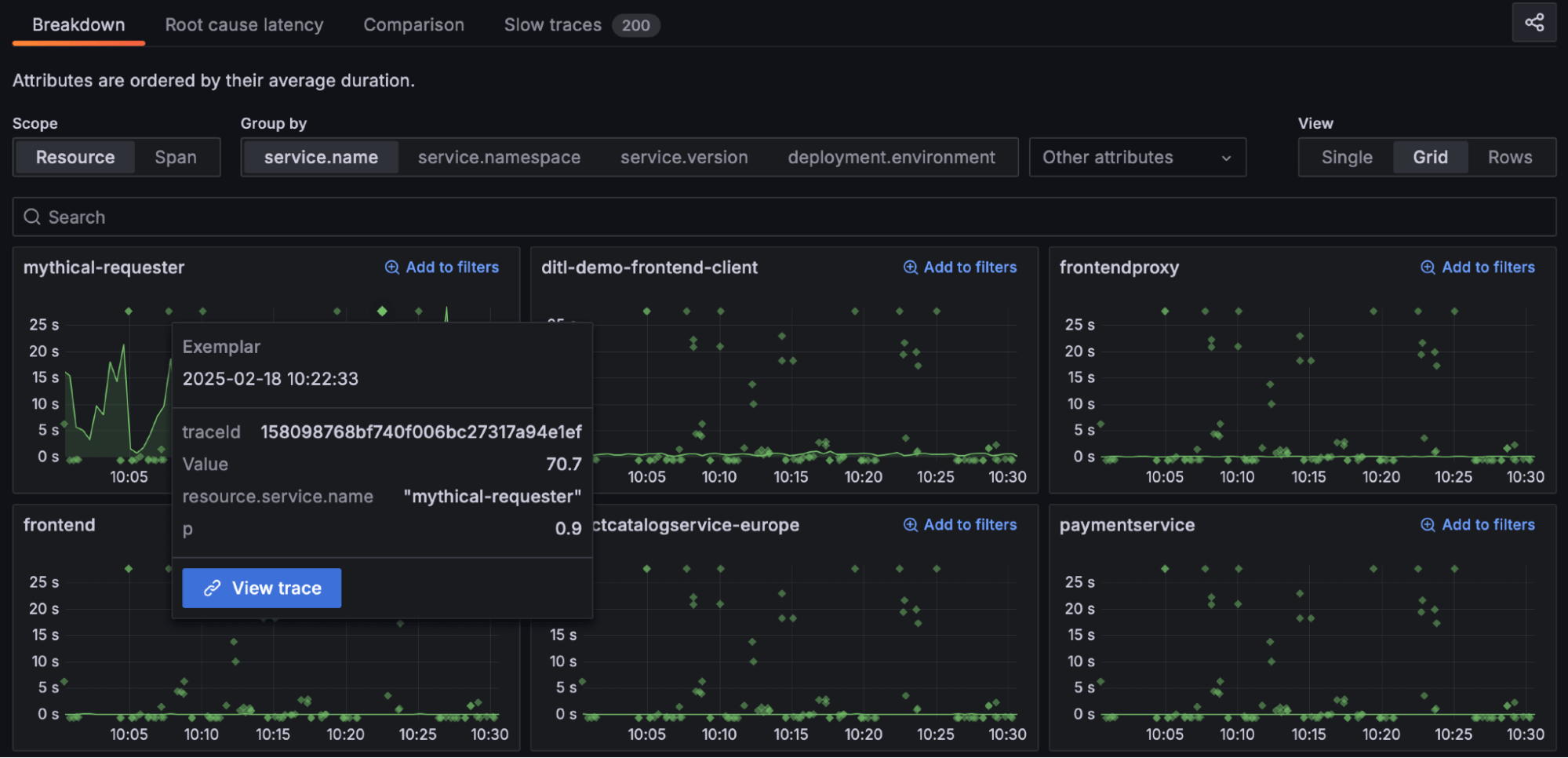 Metrics are great for giving you an aggregated system overview—when and where a problem happened. But traces reveal a detailed story behind each request or transaction—why and how it happened. With exemplars, we connect these two worlds seamlessly. Each exemplar, marked by a highlighted star, links you to the corresponding trace, so you can jump from your metric of interest directly to a single-request view.