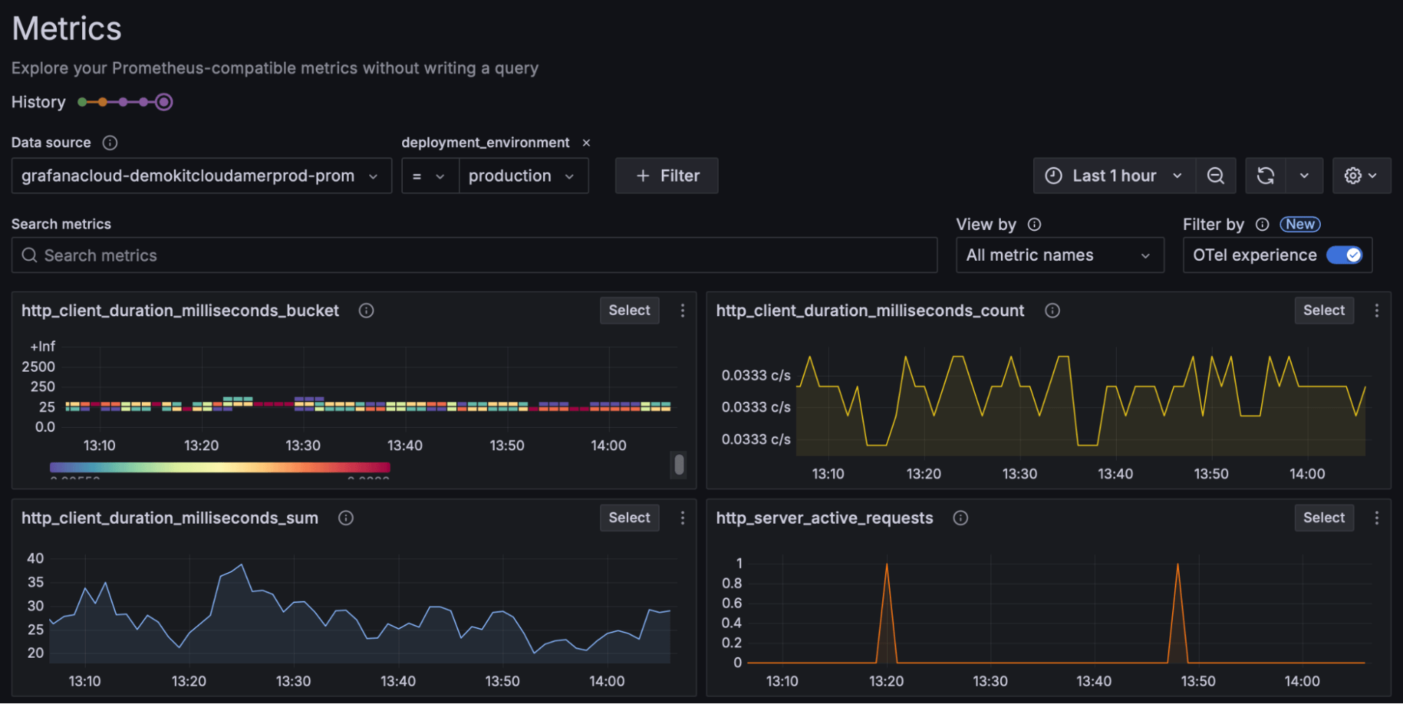 Prometheus has long supported the OpenTelemetry protocol (OTLP), but querying non-promoted resource attributes can still be cumbersome. Grafana Metrics Drilldown’s OTel experience mode now automates these behind-the-scenes label joins, freeing you from complex manual queries so you can stay focused on the insights.