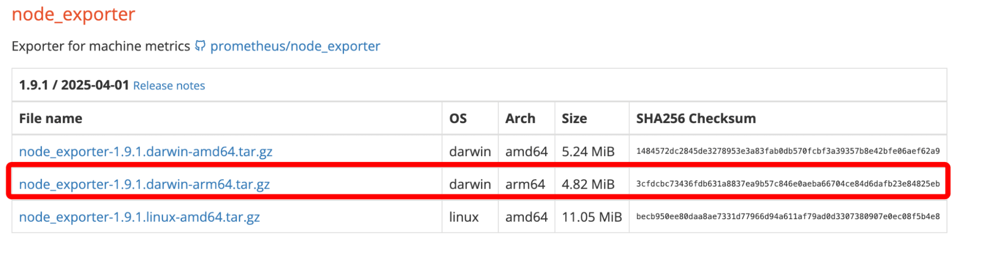 While you’re there, also download node exporter—this tool gathers machine metrics like CPU, memory, and disk space.