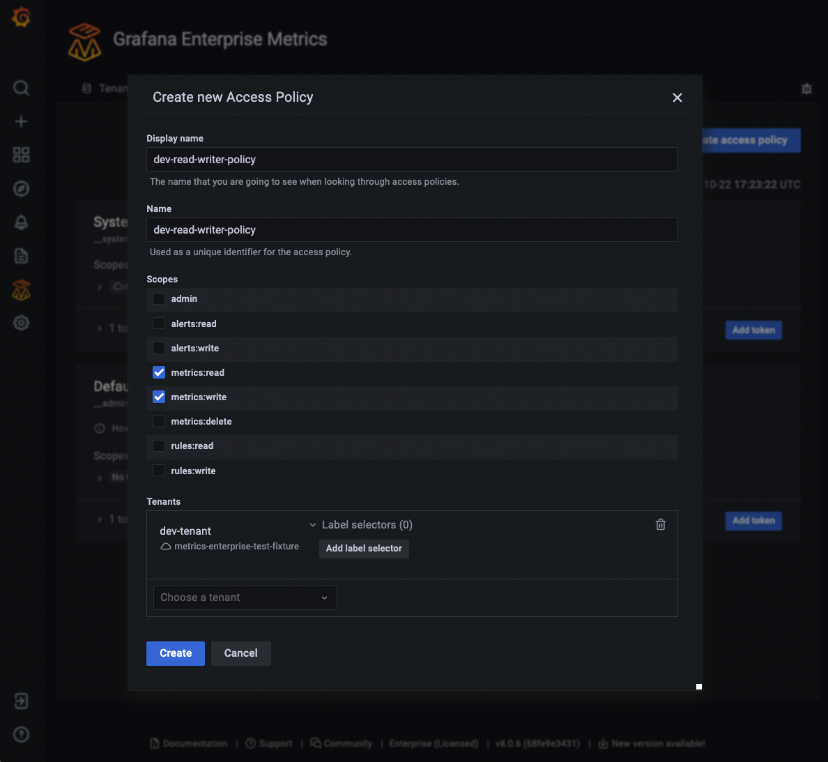 Create a data source access policy and token, which are used by Grafana Enterprise itself to access the metrics in the tenant named dev-tenant: