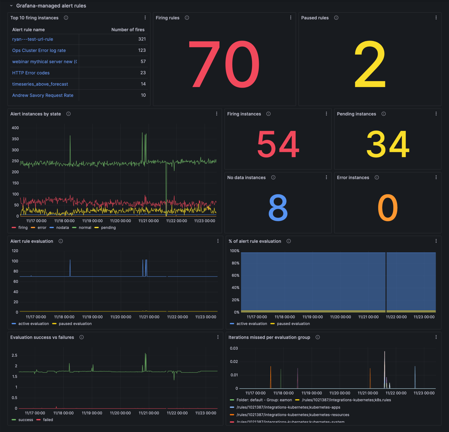 The panels in Alerting Insights query metrics and logs from various data sources within your Grafana Cloud stack. For more details on querying this data, refer to Meta monitoring.
