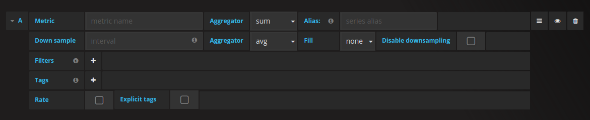 Open a graph in edit mode by click the title. Query editor will differ if the data source has version <=2.1 or = 2.2. In the former version, only tags can be used to query OpenTSDB. But in the latter version, filters as well as tags can be used to query OpenTSDB. Fill Policy is also introduced in OpenTSDB 2.2.