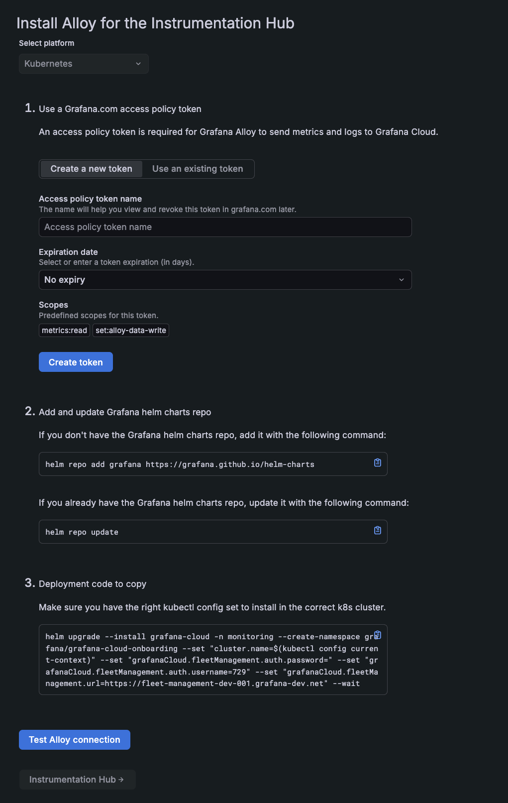 Select platform: Notice Kubernetes is already selected. This is the only platform that Instrument Hub currently works with.