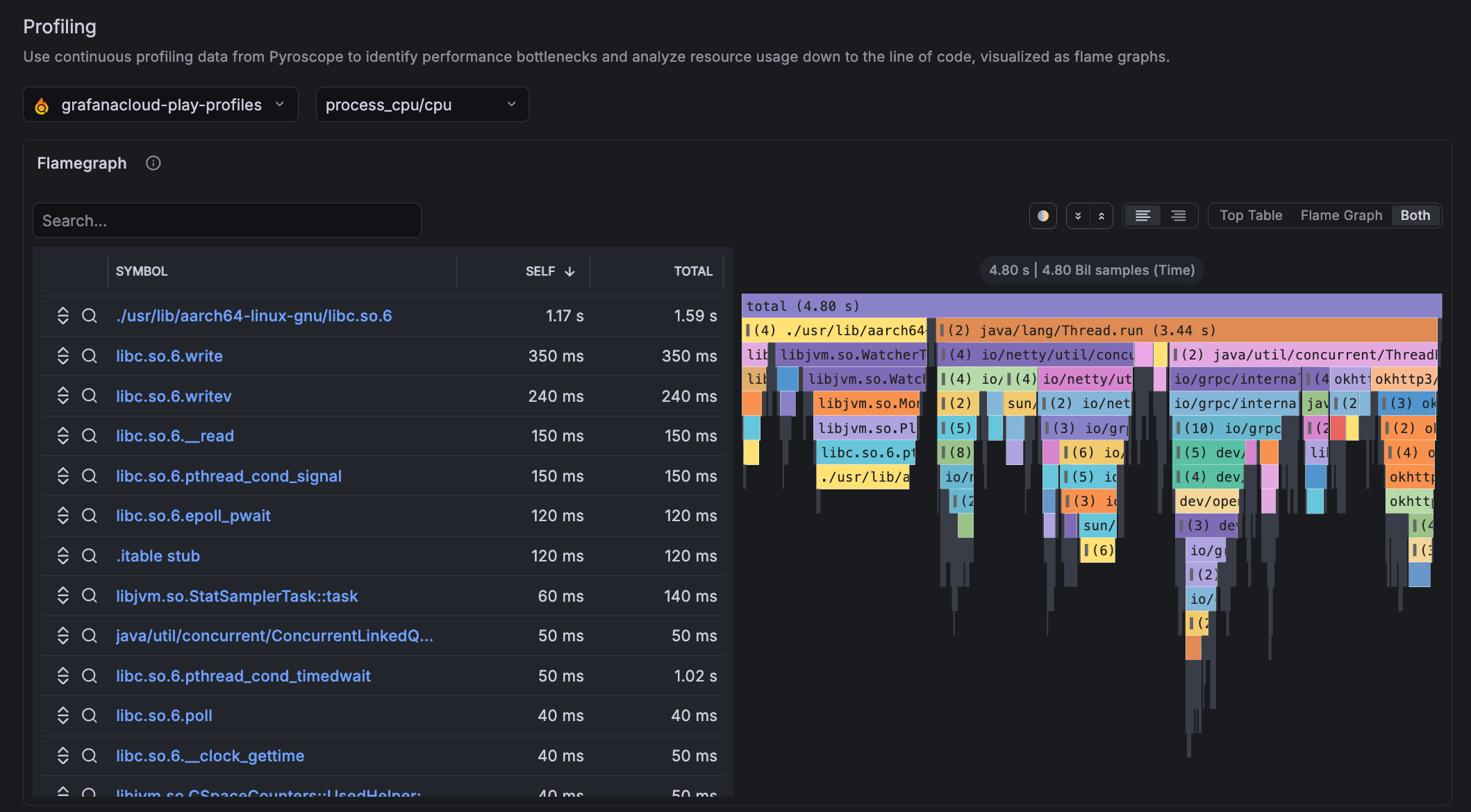 Profiling data requires instrumentation on the application side. The flame graph works with the Pyroscope instance in Grafana Cloud. To see profiling data, one of the following ingestion methods must be used for profiling data to appear:
